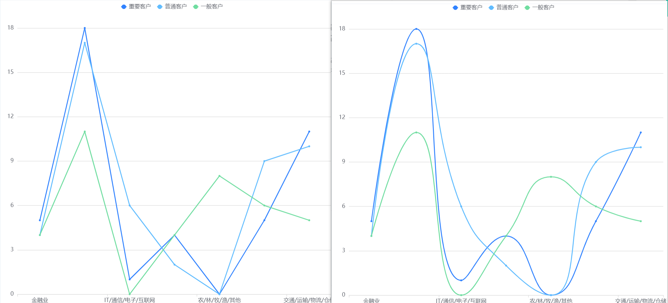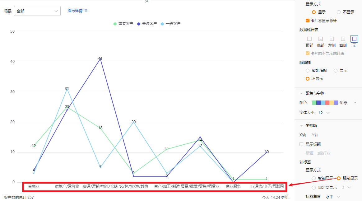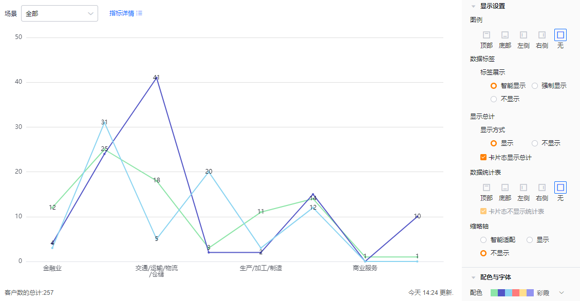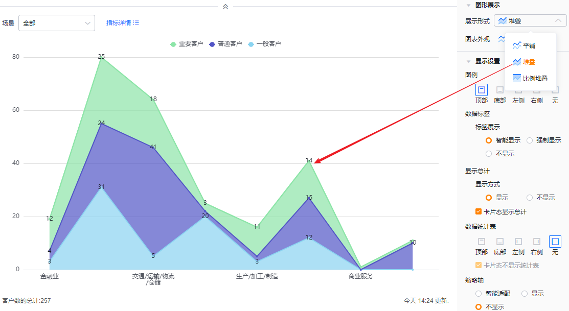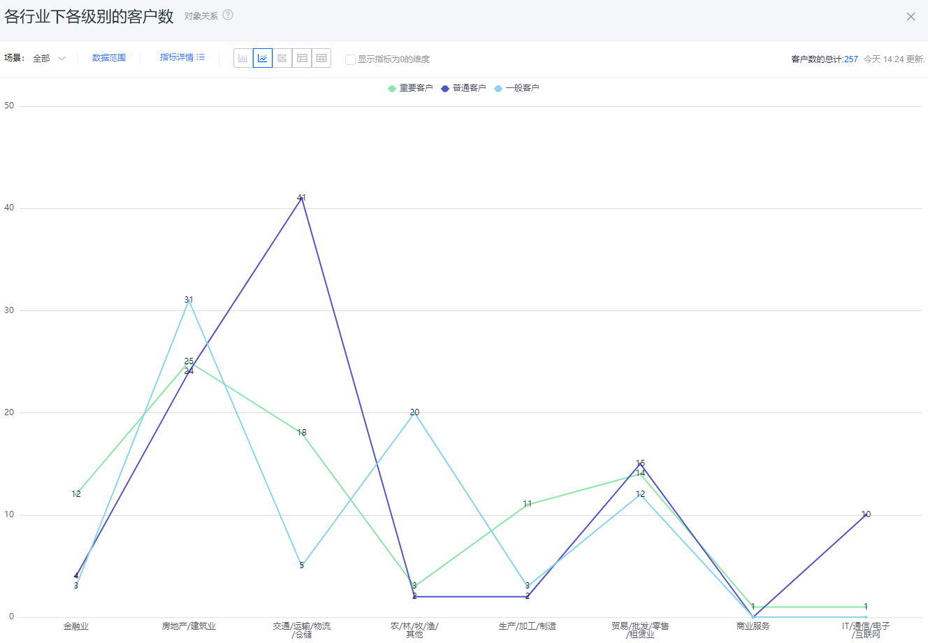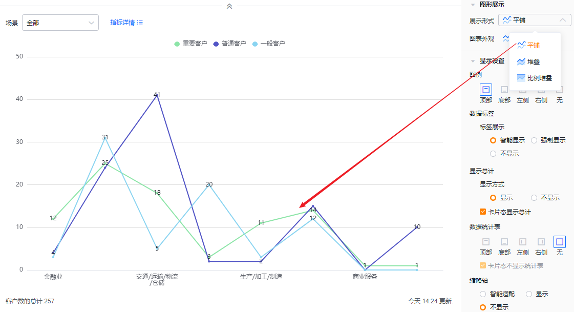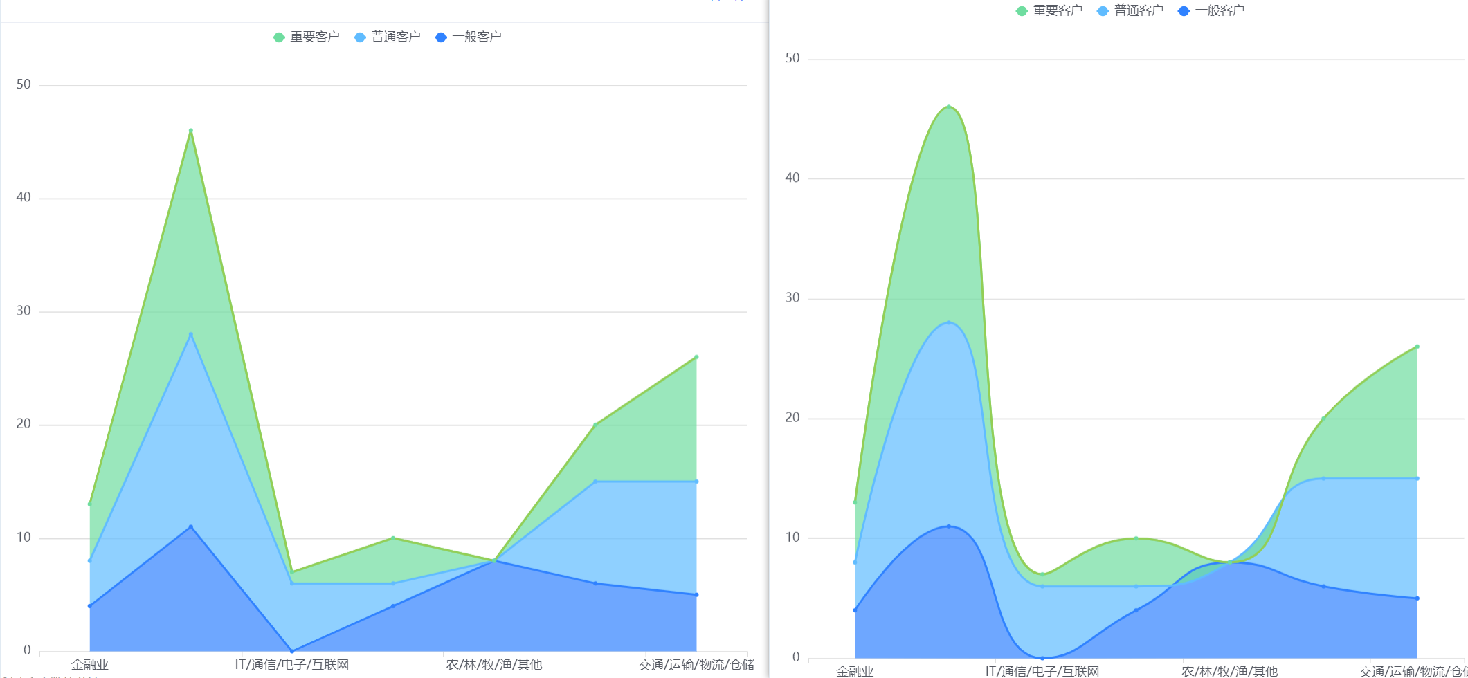 The stacked line chart shows the trend of each second-dimension value across a range of data under a primary dimension. For example, it can compare the number of Accounts across different industries and Account tiers.