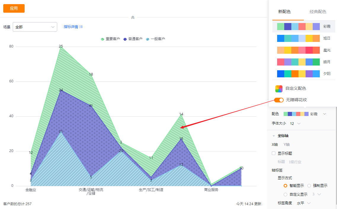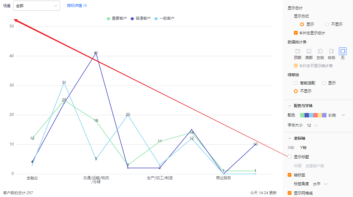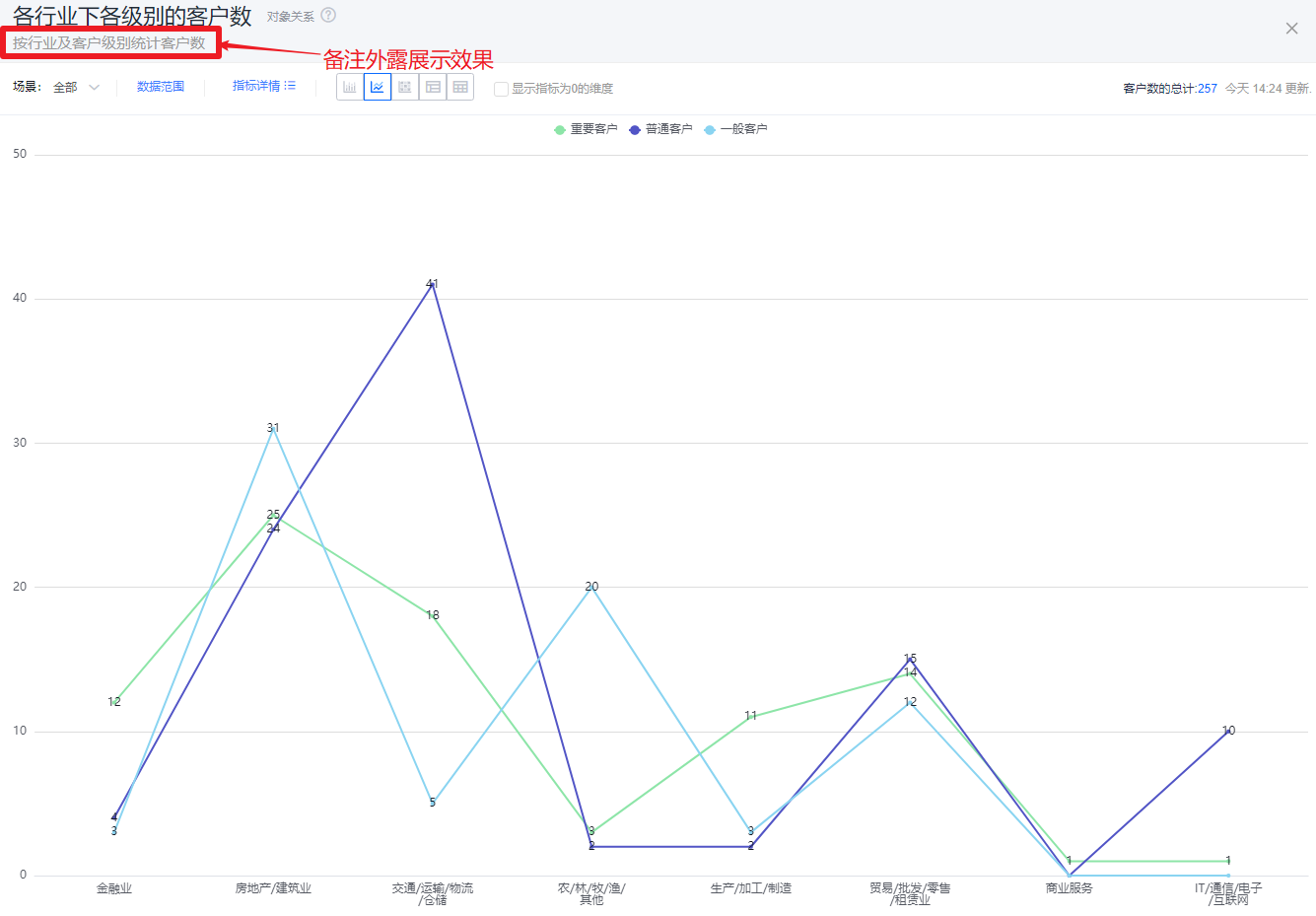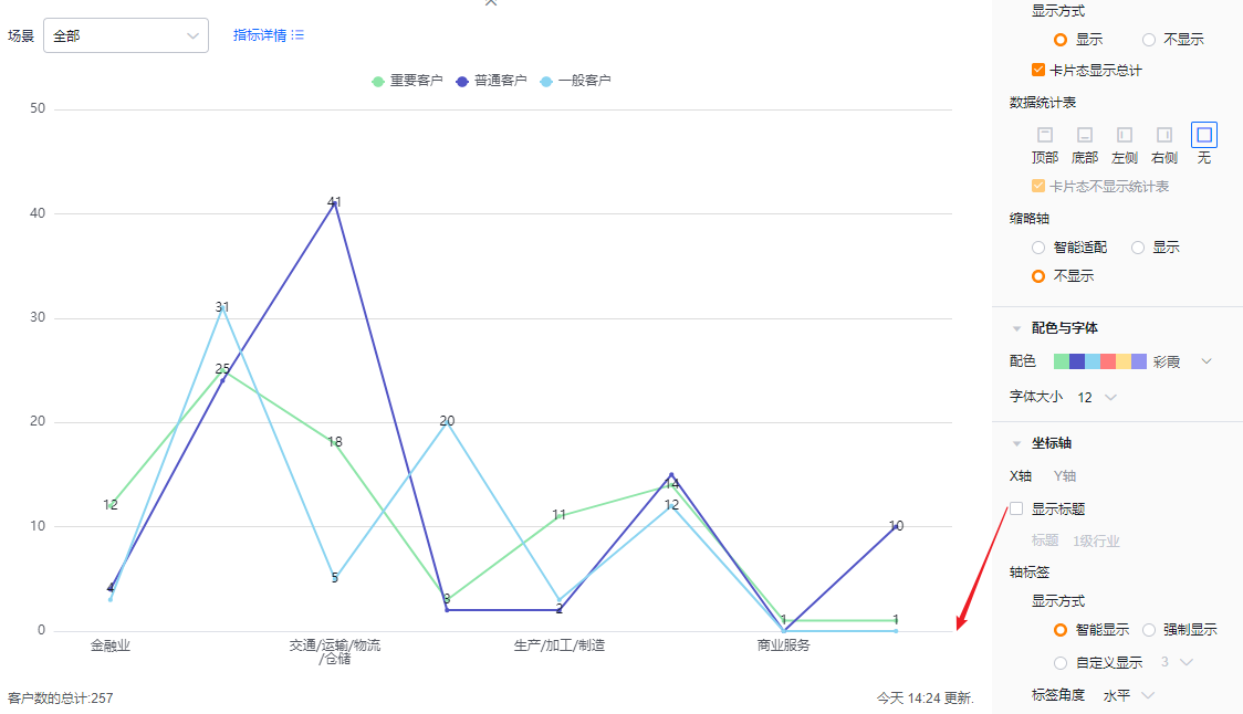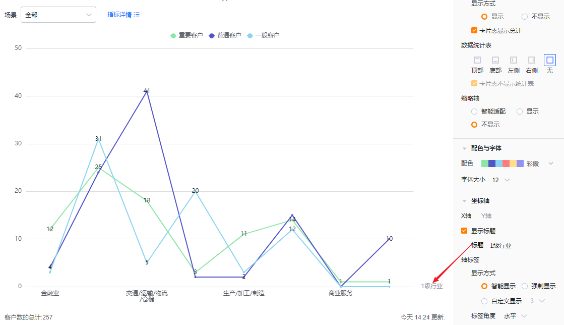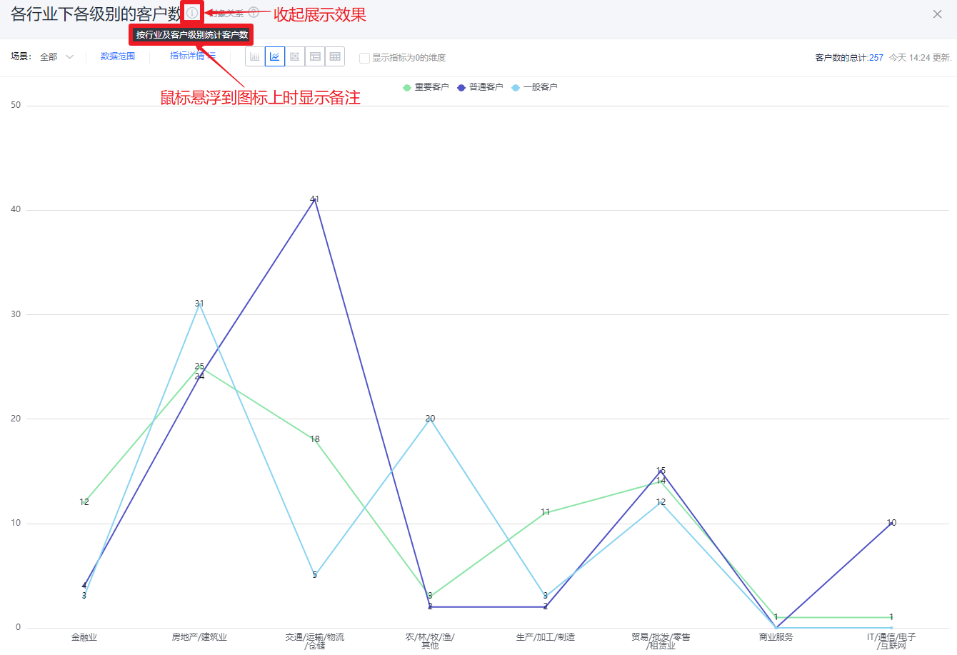 The stacked line chart shows the trend of each second-dimension value across a range of data under a primary dimension. For example, it can compare the number of Accounts across different industries and Account tiers.