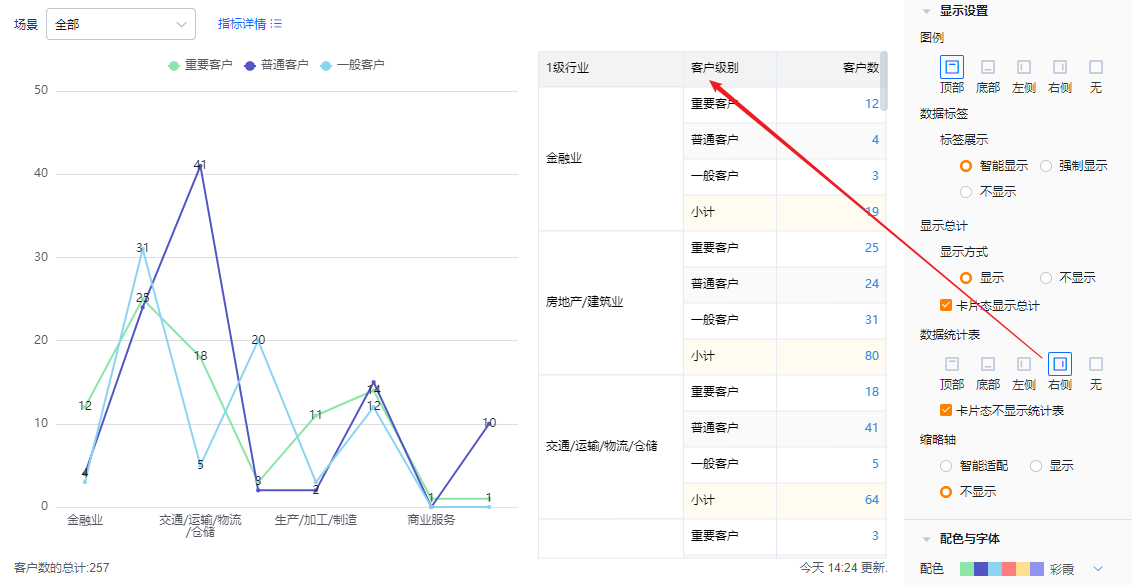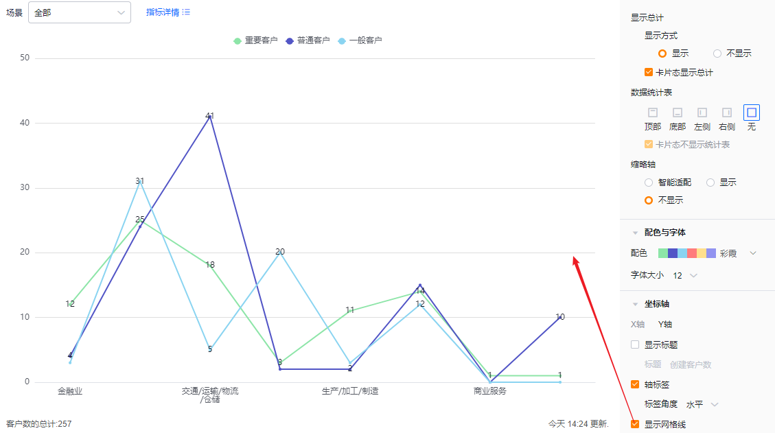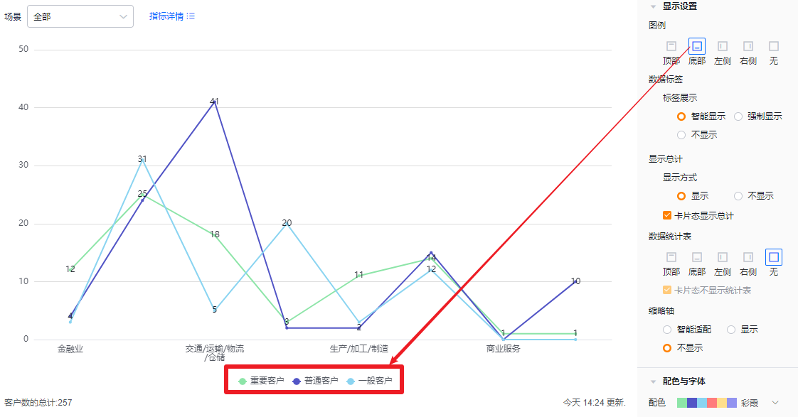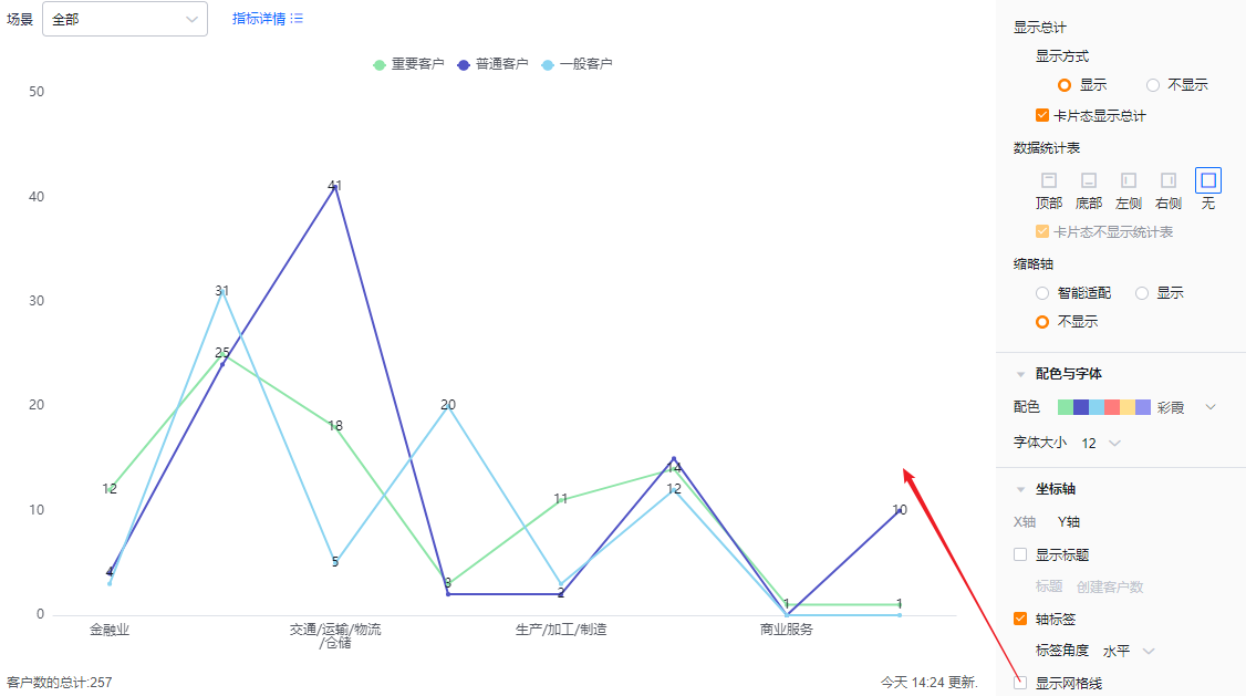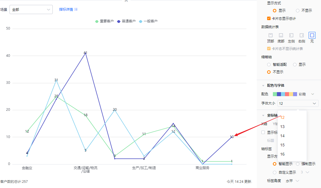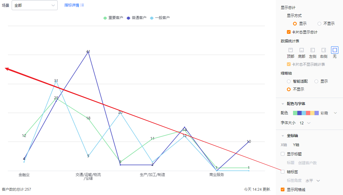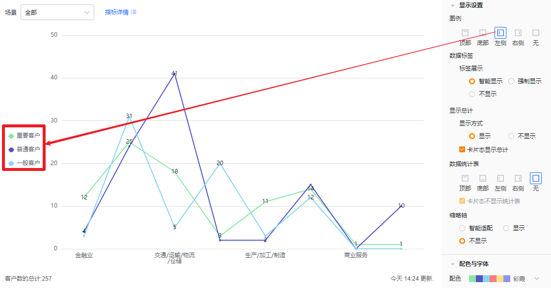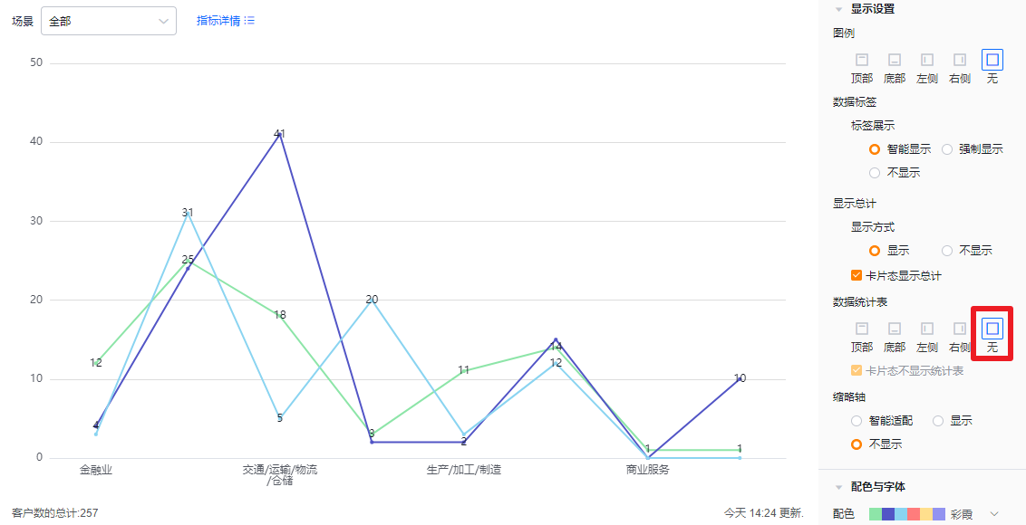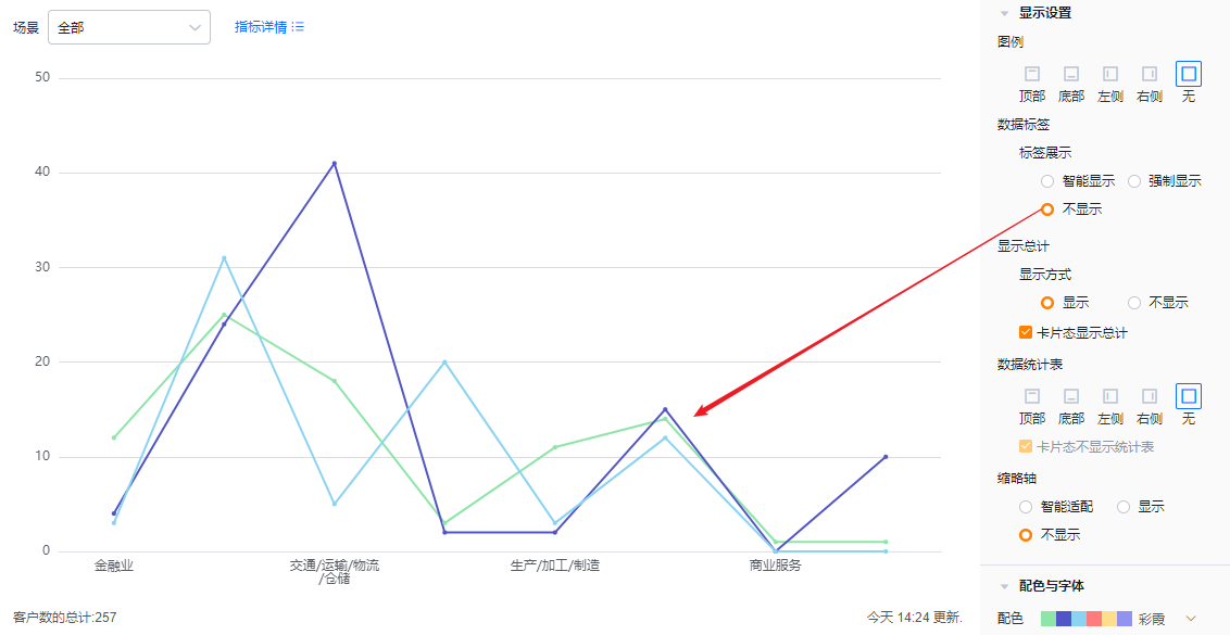 The stacked line chart shows the trend of each second-dimension value across a range of data under a primary dimension. For example, it can compare the number of Accounts across different industries and Account tiers.