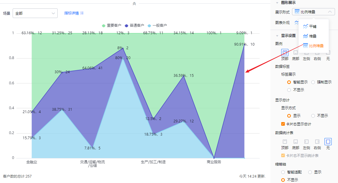 - Display mode: Default is Tile; you can switch to Stacked or 100% Stacked