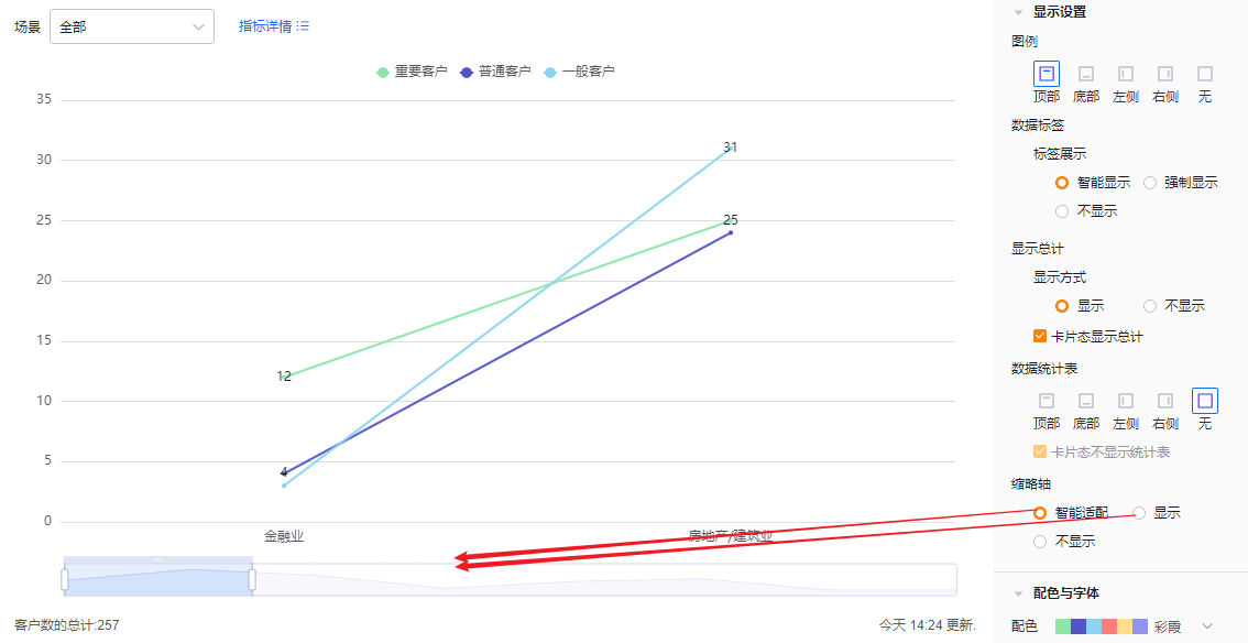 - Smart: The system determines whether to show the overview axis based on available space and number of dimension values. If values exceed the displayable amount, the overview axis appears.