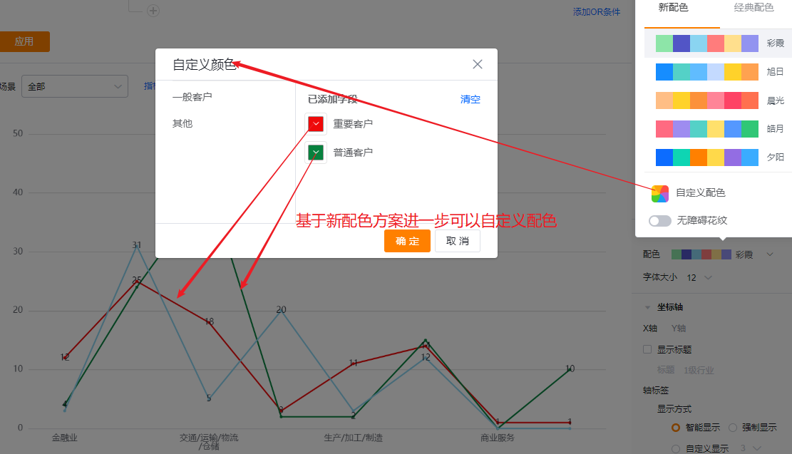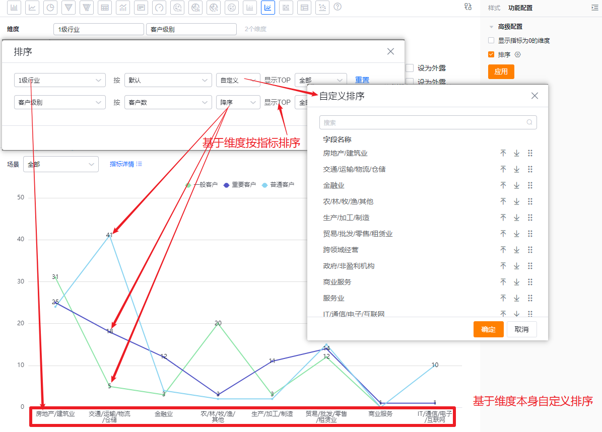 - When the dimension is an enumeration or Dept. field, custom sorting is supported.