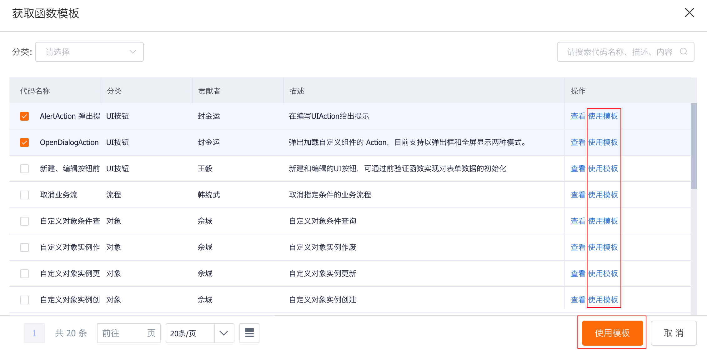 • In function templates, all system prefabricated function templates are listed by category, and you can view the content of the function templates. Click the Use Template button to return the content of the function template to the function editing page.