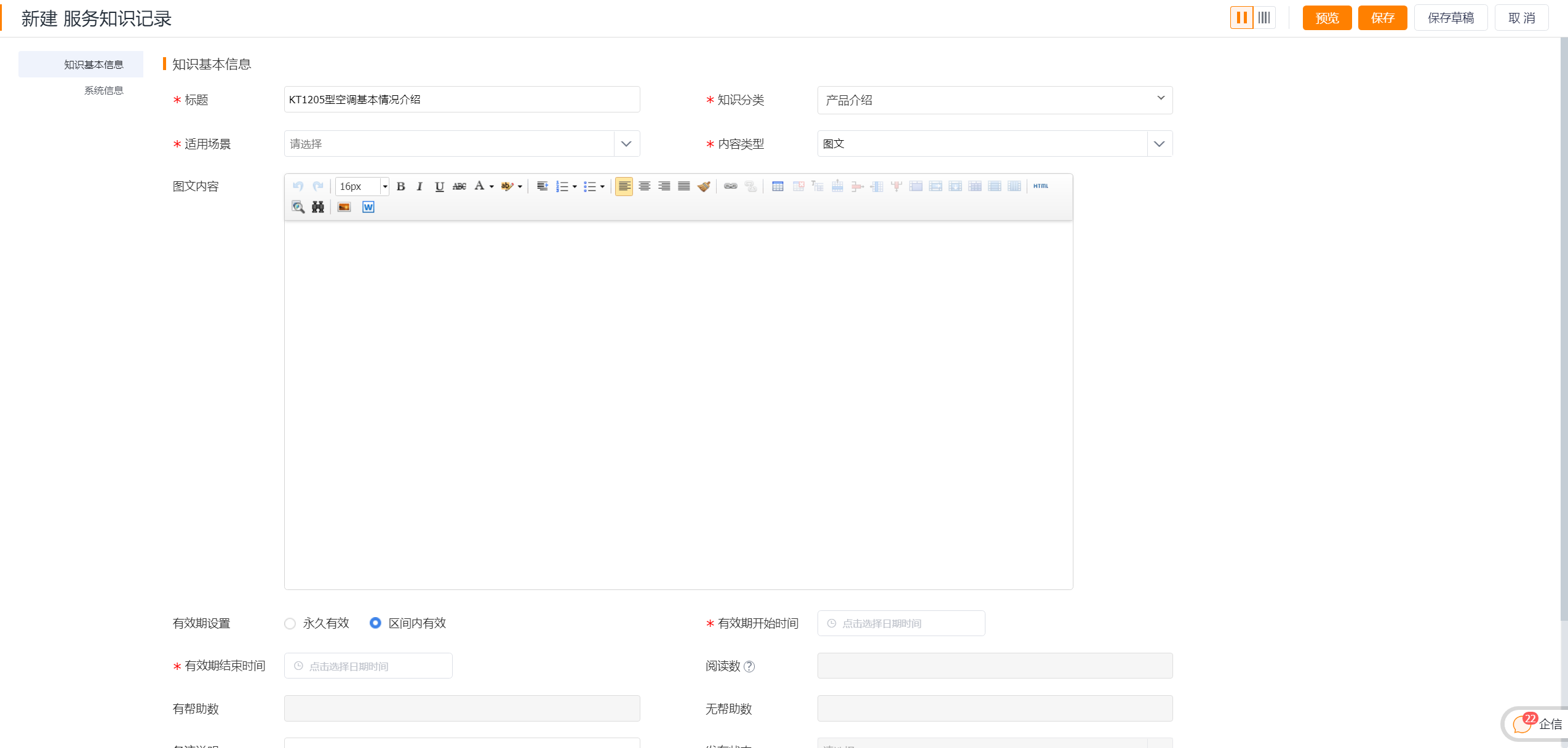 - Support setting validity period for knowledge records, only knowledge documents within the validity period will be seen by users.