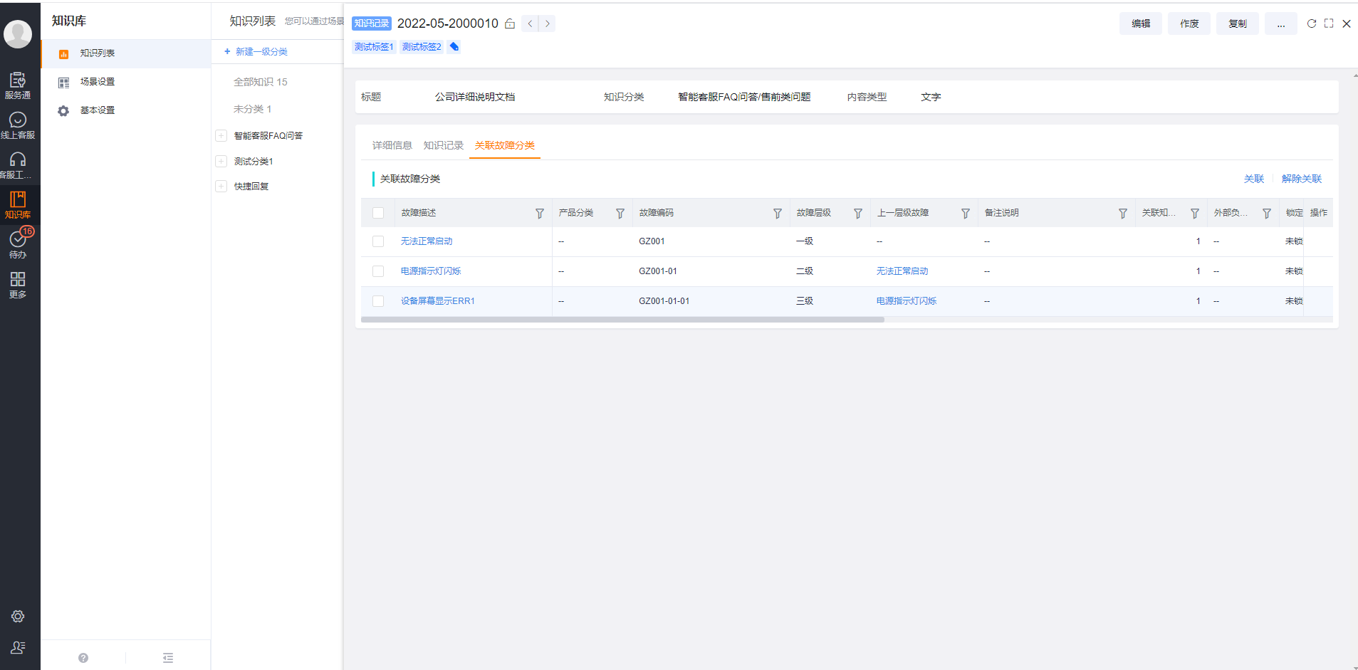 - An associated fault classification tab will be added to the service knowledge record object details page; at the same time, an associated service knowledge record tab will be added to the service fault classification details page to realize data association between faults and knowledge records;