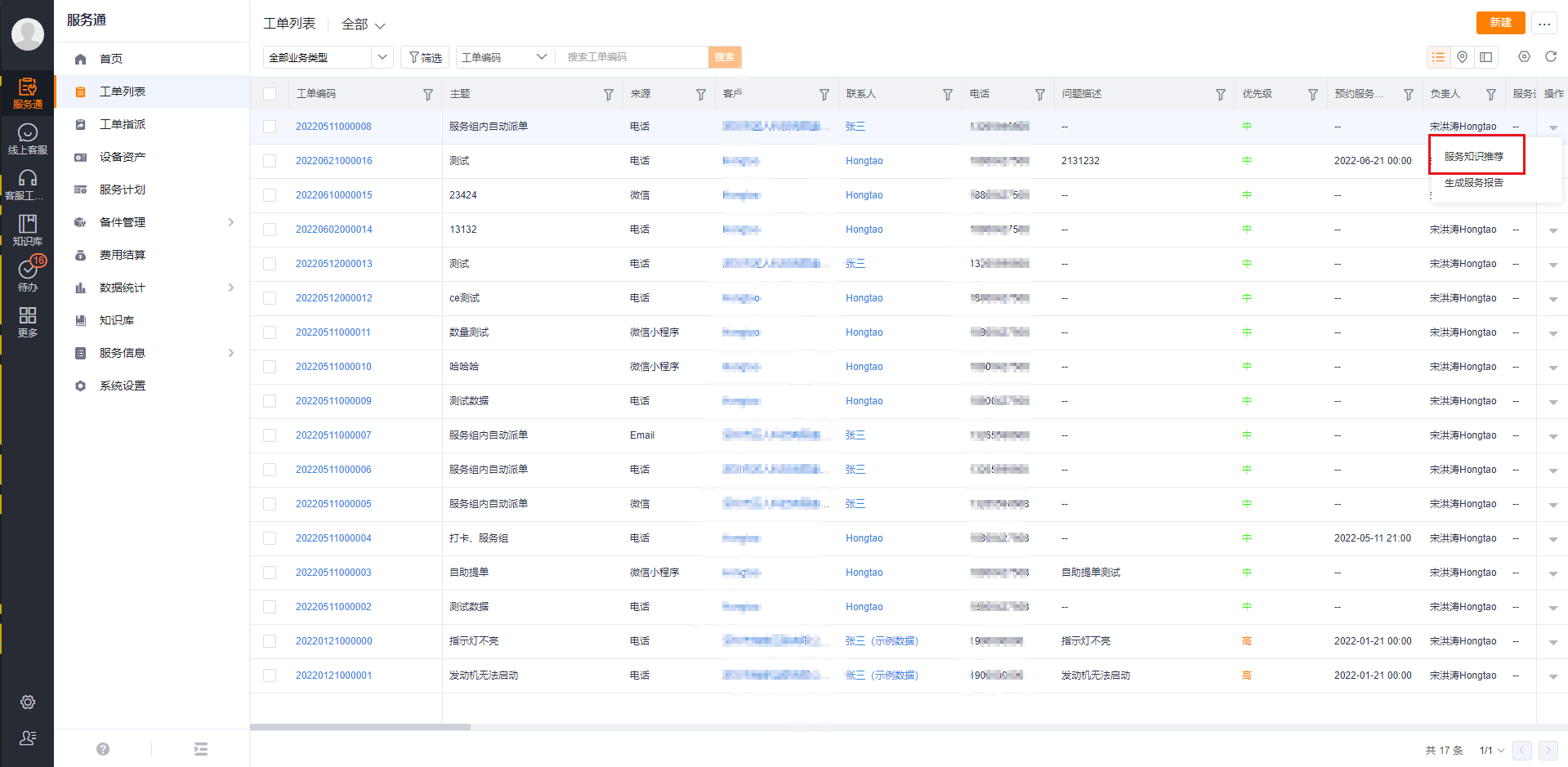 After the fault classification module is enabled, when this function is enabled again, the [Service Knowledge Recommendation] button will be preset in the work order list and details page, and the service knowledge records associated with the service fault classification will be recommended first; at the same time, you can also view the corresponding record of knowledge.