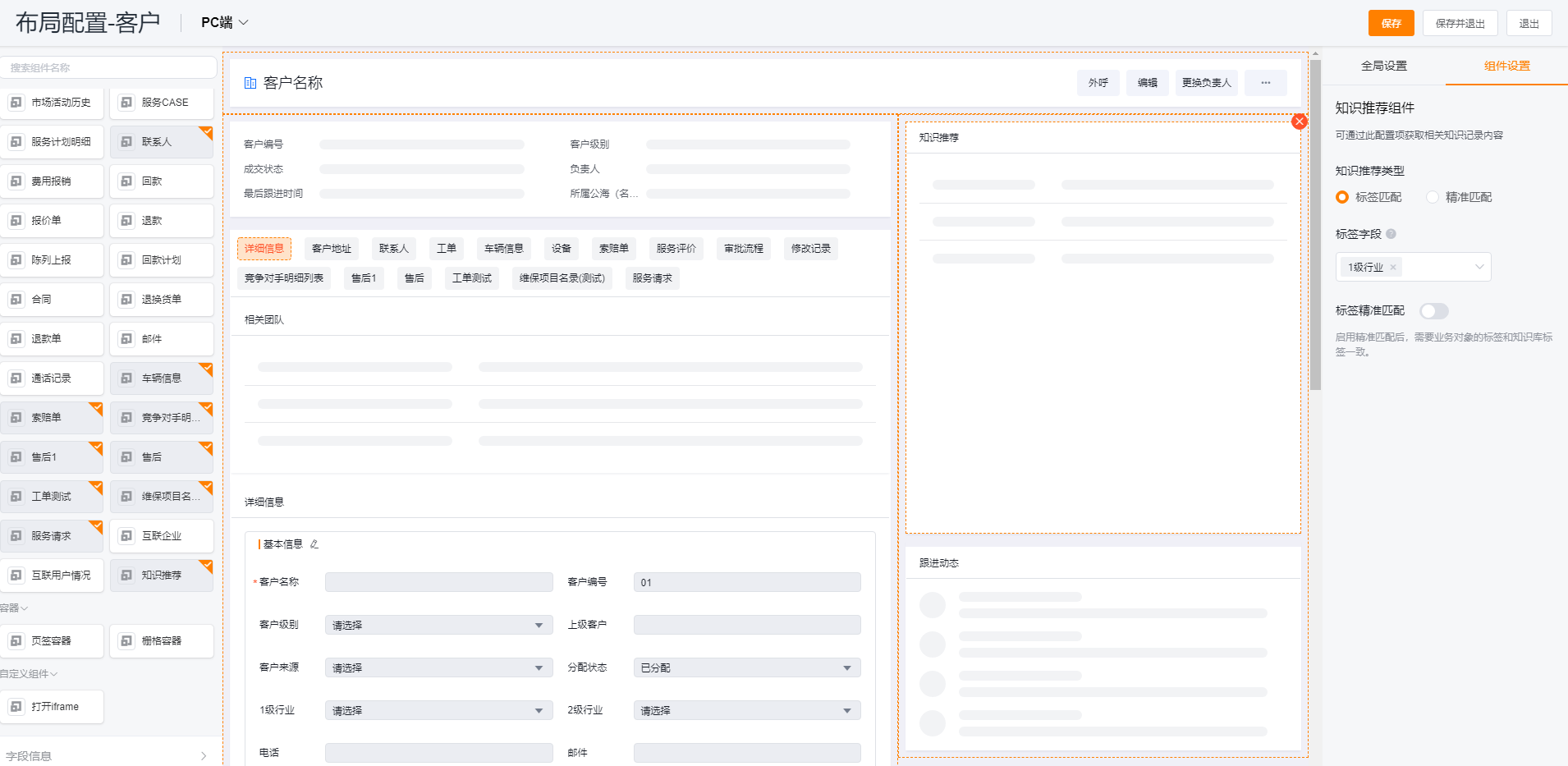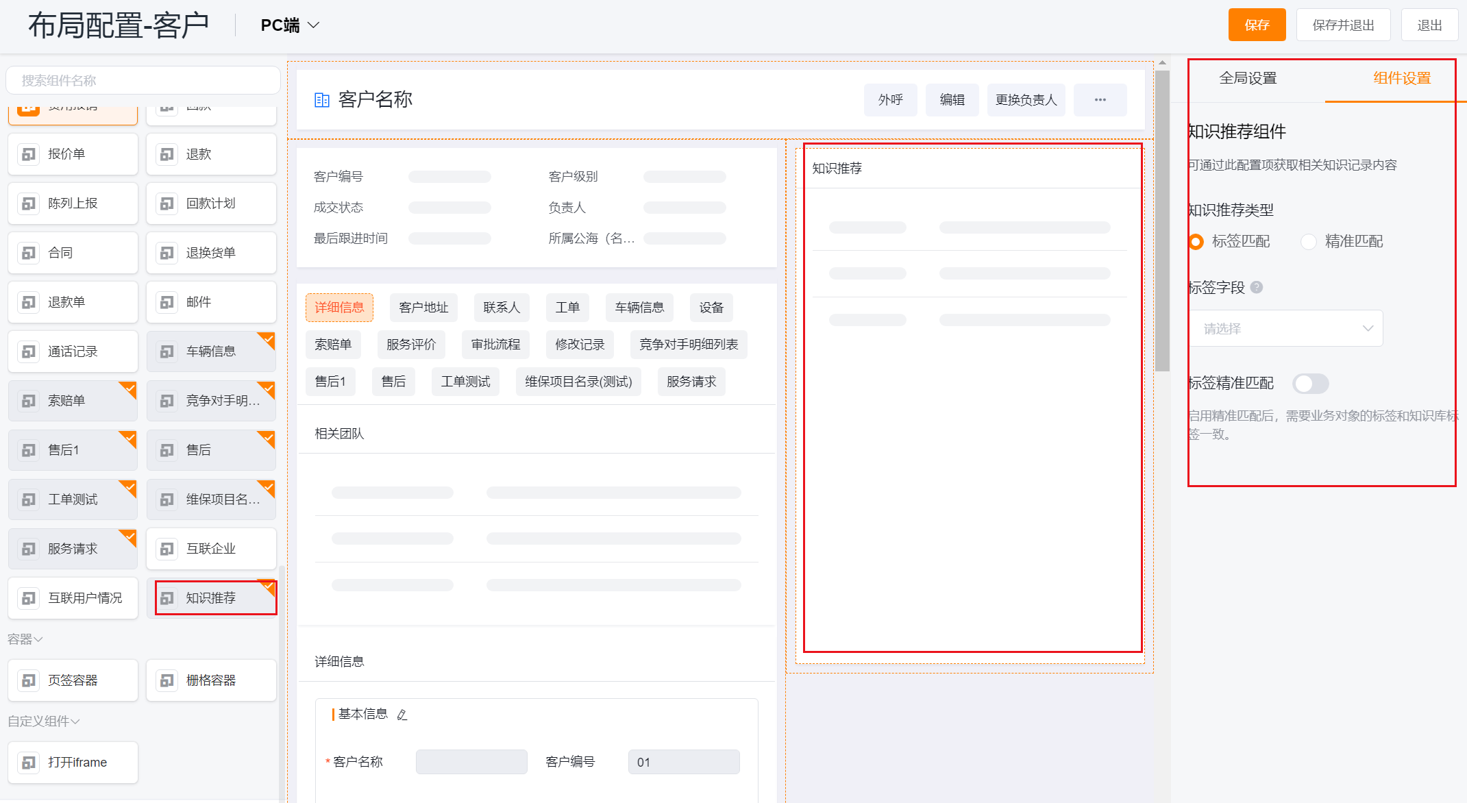 1. Configuration path: You can use the knowledge recommendation component under any object to open the object layout that you want to recommend data. Here we take the customer object as an example. In the customer object layout ---> business component list, find the [knowledge recommendation] component , and drag the component onto the layout.