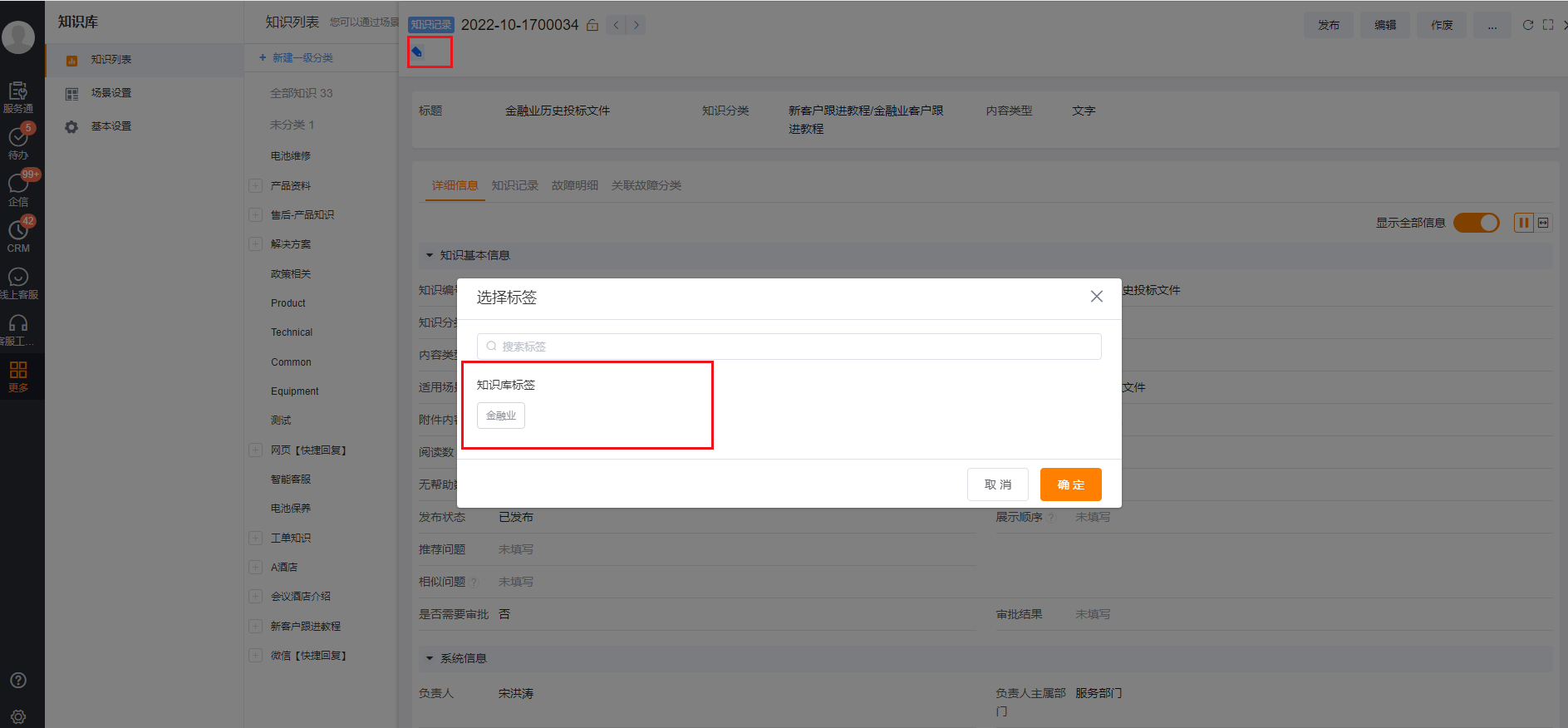 Through the above two steps, the adding action of the label is completed in the system, and the label needs to be specifically marked on the knowledge base data. The path to add labels to the knowledge base data is as follows: knowledge base application ---> knowledge list ---> specific knowledge records ---> label button