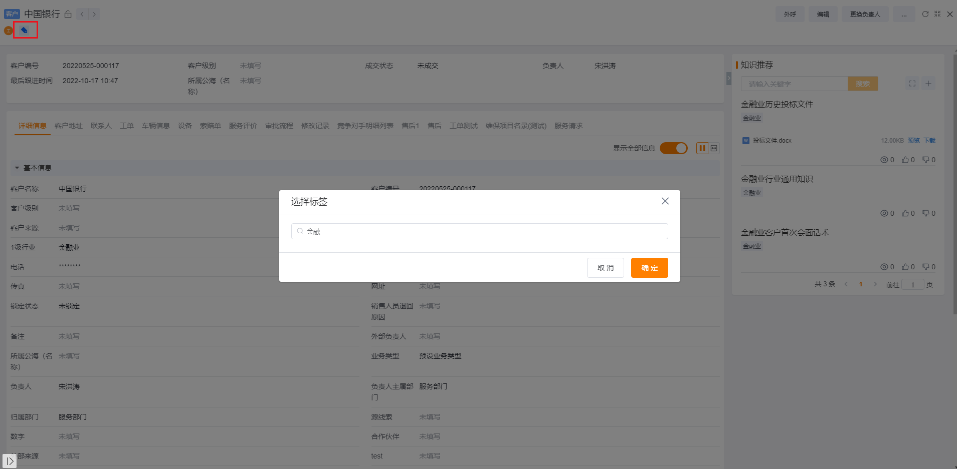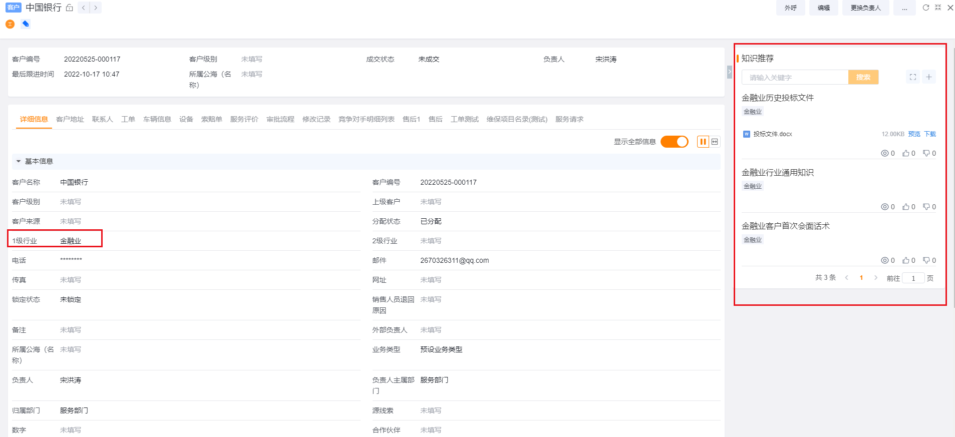 Taking the data configured in the above configuration tutorial as an example, the knowledge recommendation component is set under the "customer" object, and the "level 1 industry" field is set as the label field, and some data is also set with the "financial industry" label in the knowledge base , when opening the details page, the system will automatically determine the customer's level 1 industry and recommend knowledge.
