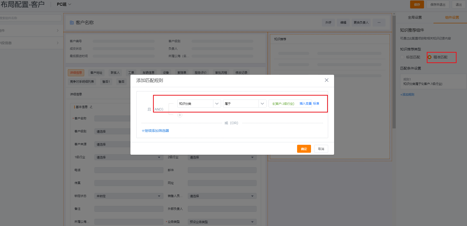 2.2 Accurate matching: In the knowledge recommendation component, you can set the matching conditions between the field of the knowledge base data (object name: knowledge record) and the field of the business object, for example: the knowledge classification is equal to the customer. Level 1 industry, then if the field of the knowledge classification and the customer When the field values of are the same, the knowledge will be recommended.