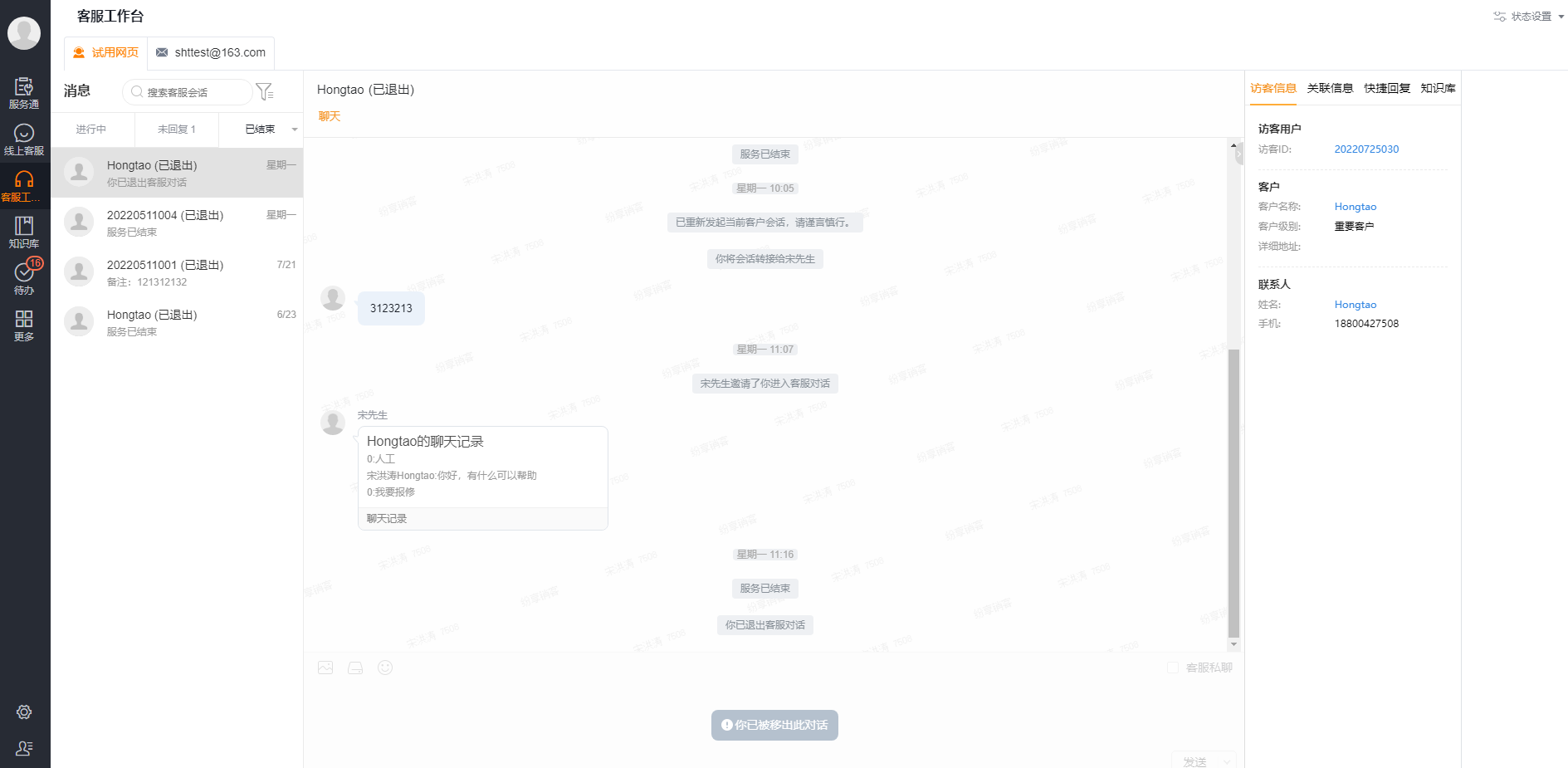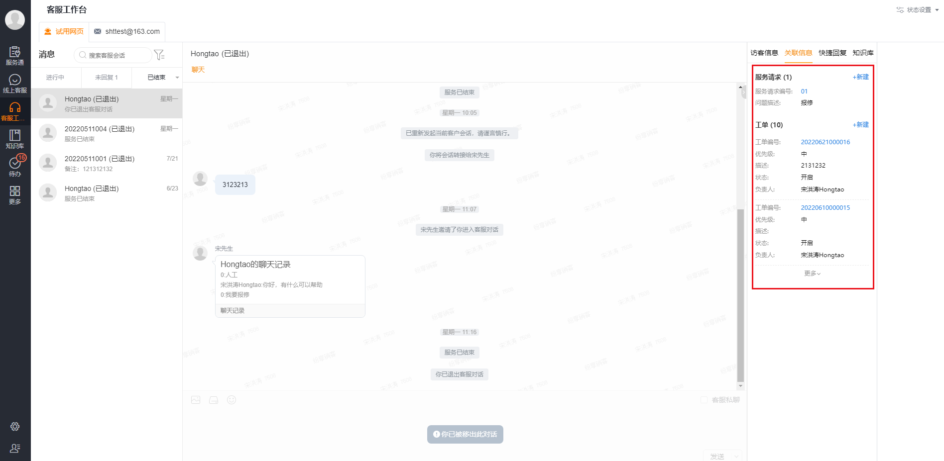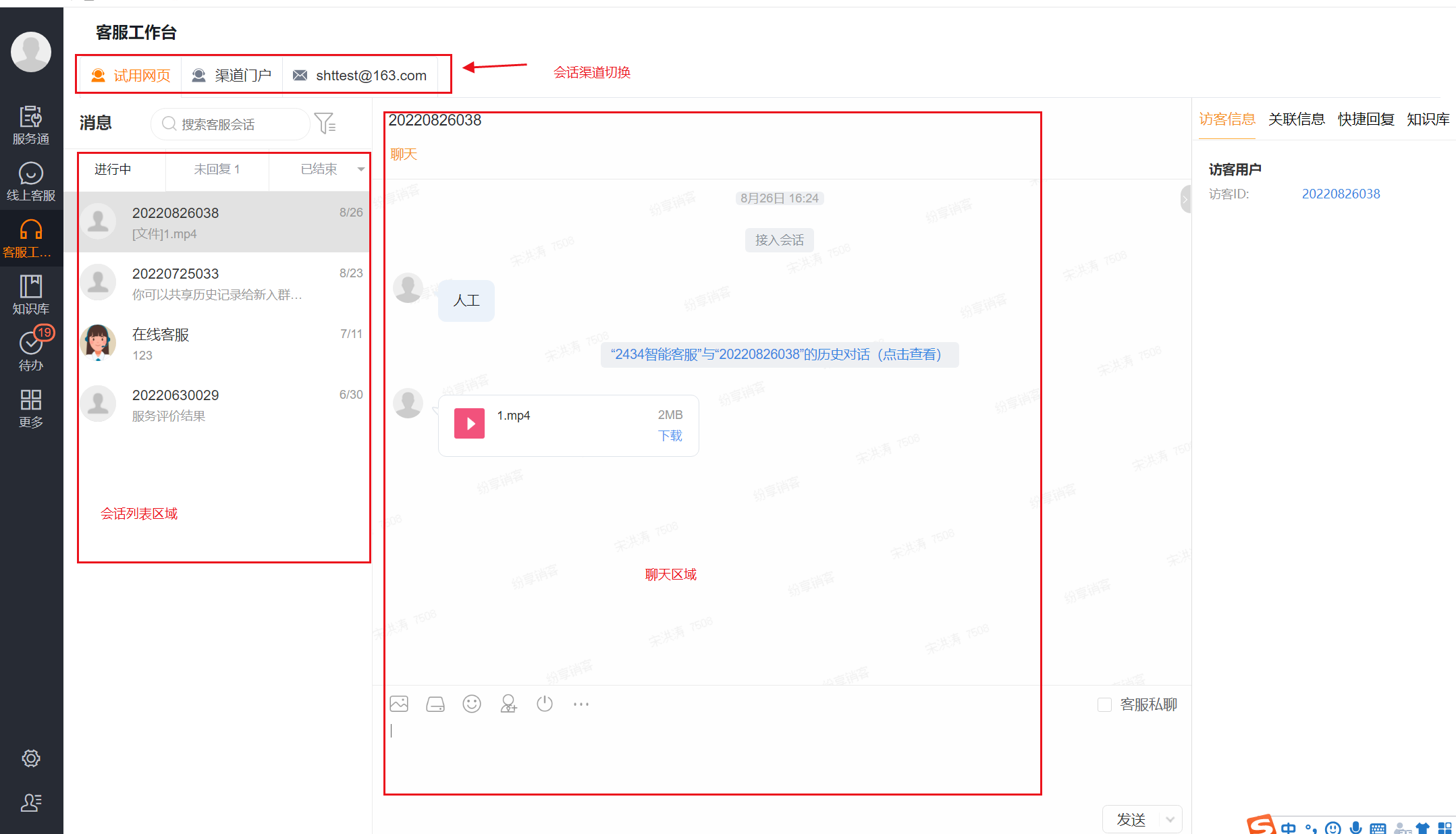 Customer service staff can view the message list on the customer service workbench, and the system automatically displays different conversation states in groups, which are mainly divided into three groups: in progress, unreplied and ended. After the customer service staff selects the specific chat records, they can reply to the account's consultation information in the dialog box. For sessions accessed through email channels, customer service personnel can reply email data online.
