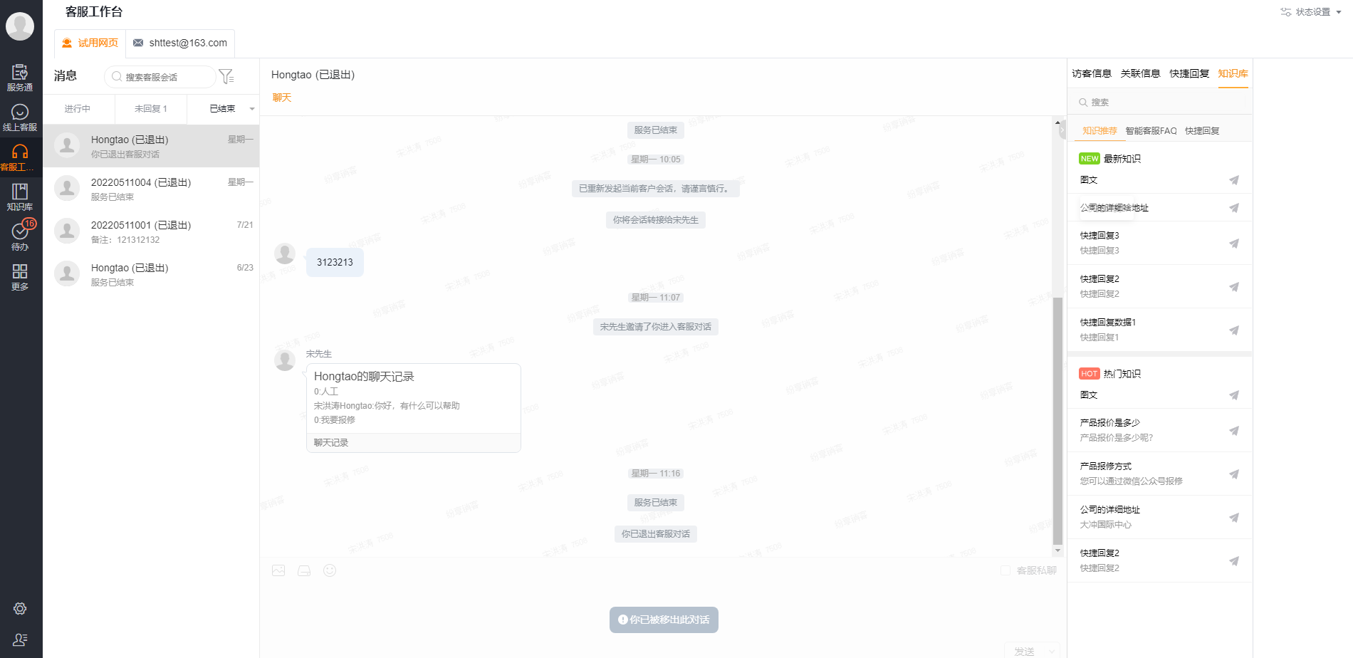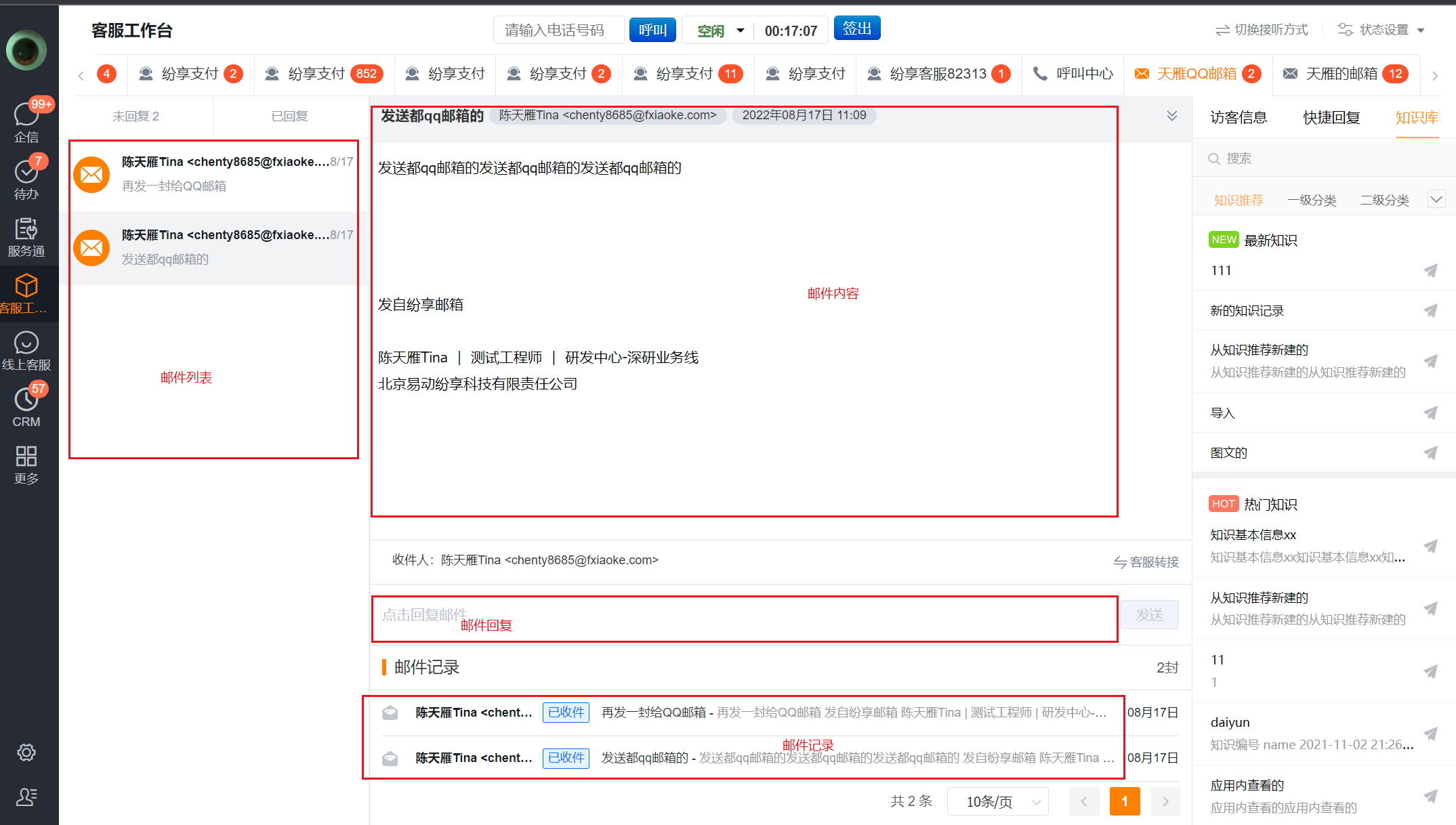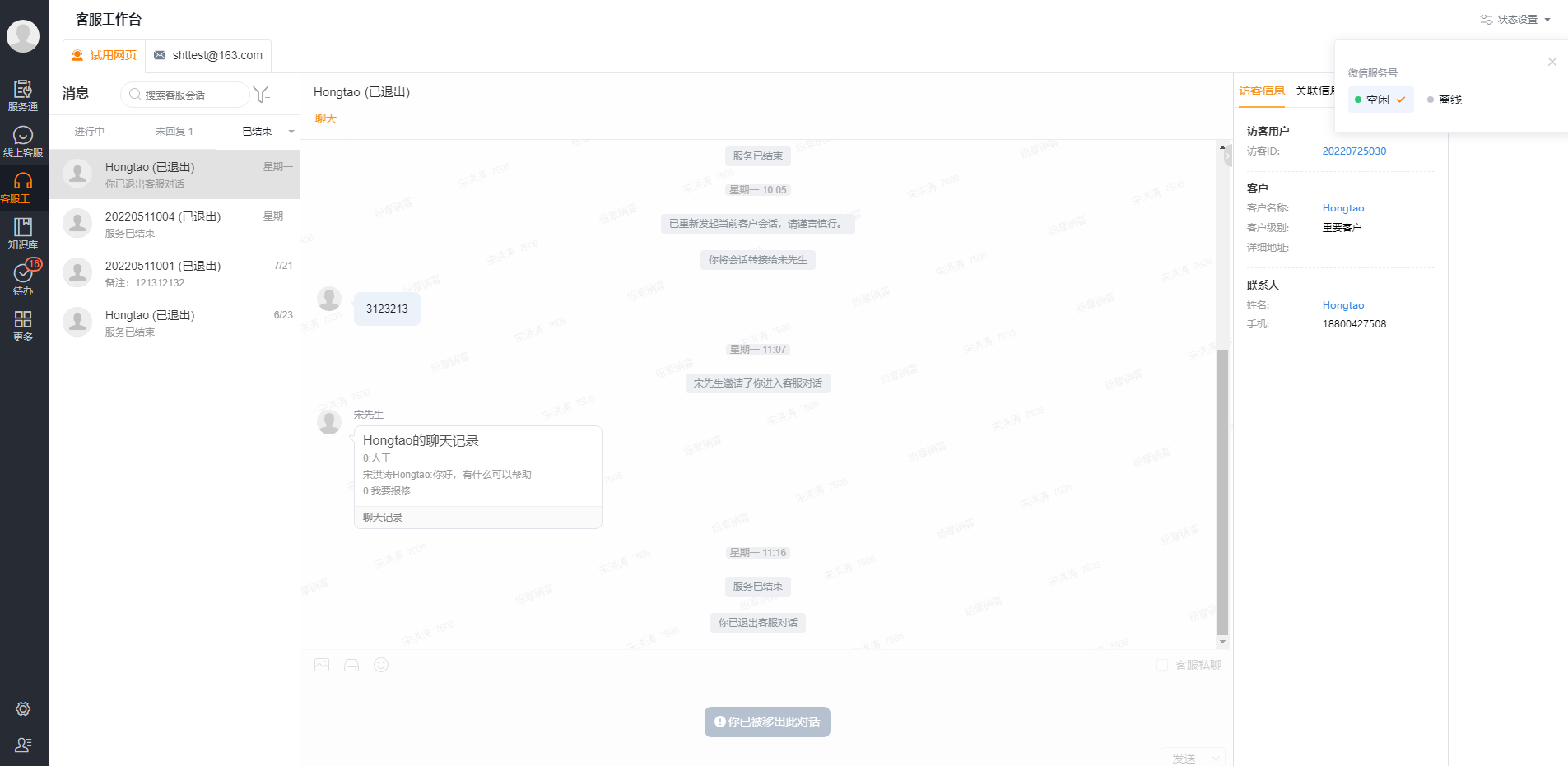 Customer service staff can view the message list on the customer service workbench, and the system automatically displays different conversation states in groups, which are mainly divided into three groups: in progress, unreplied and ended. After the customer service staff selects the specific chat records, they can reply to the account's consultation information in the dialog box. For sessions accessed through email channels, customer service personnel can reply email data online.