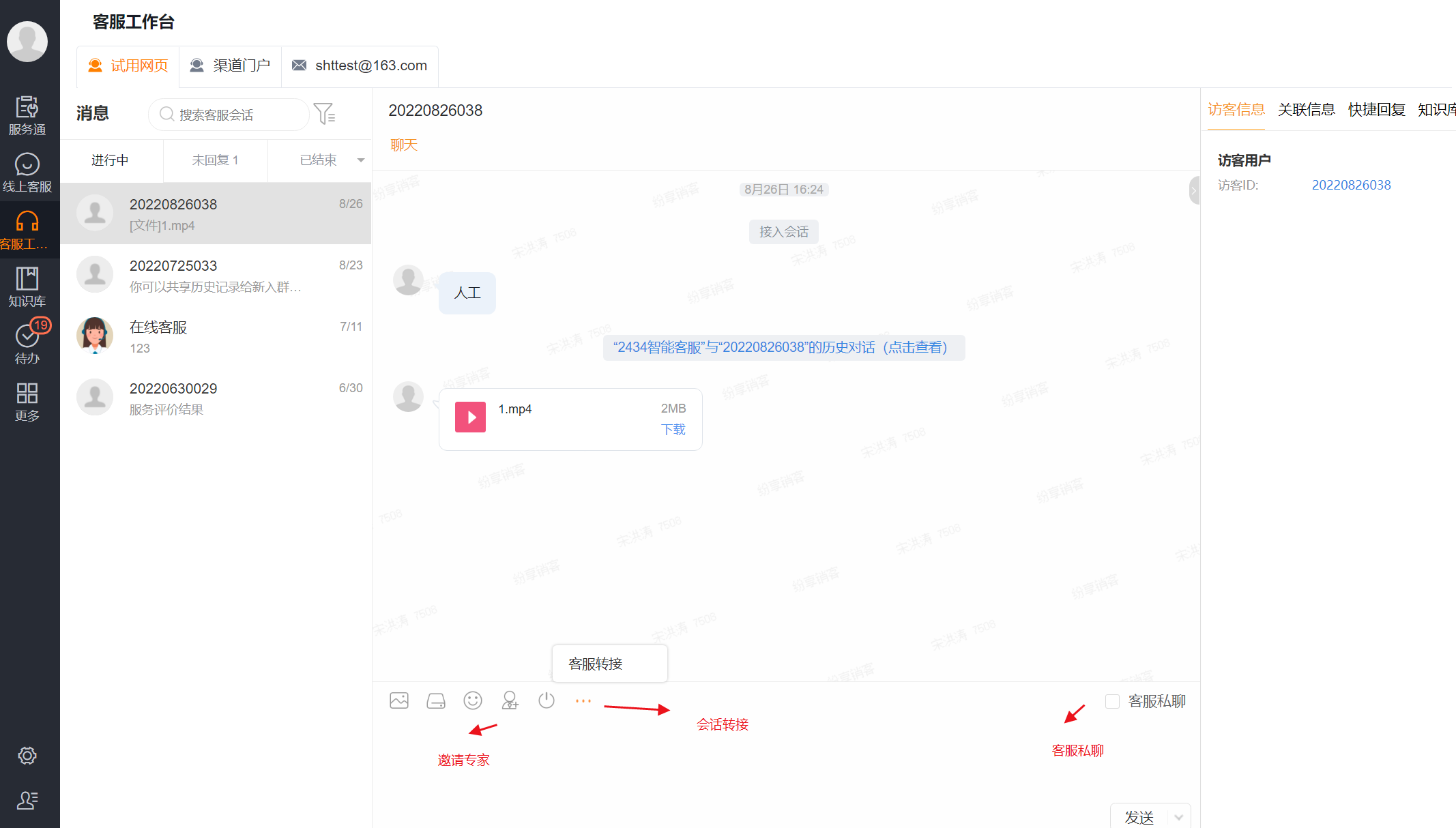 - Conversation transfer, customer service staff can perform session transfer on the customer service workbench.
