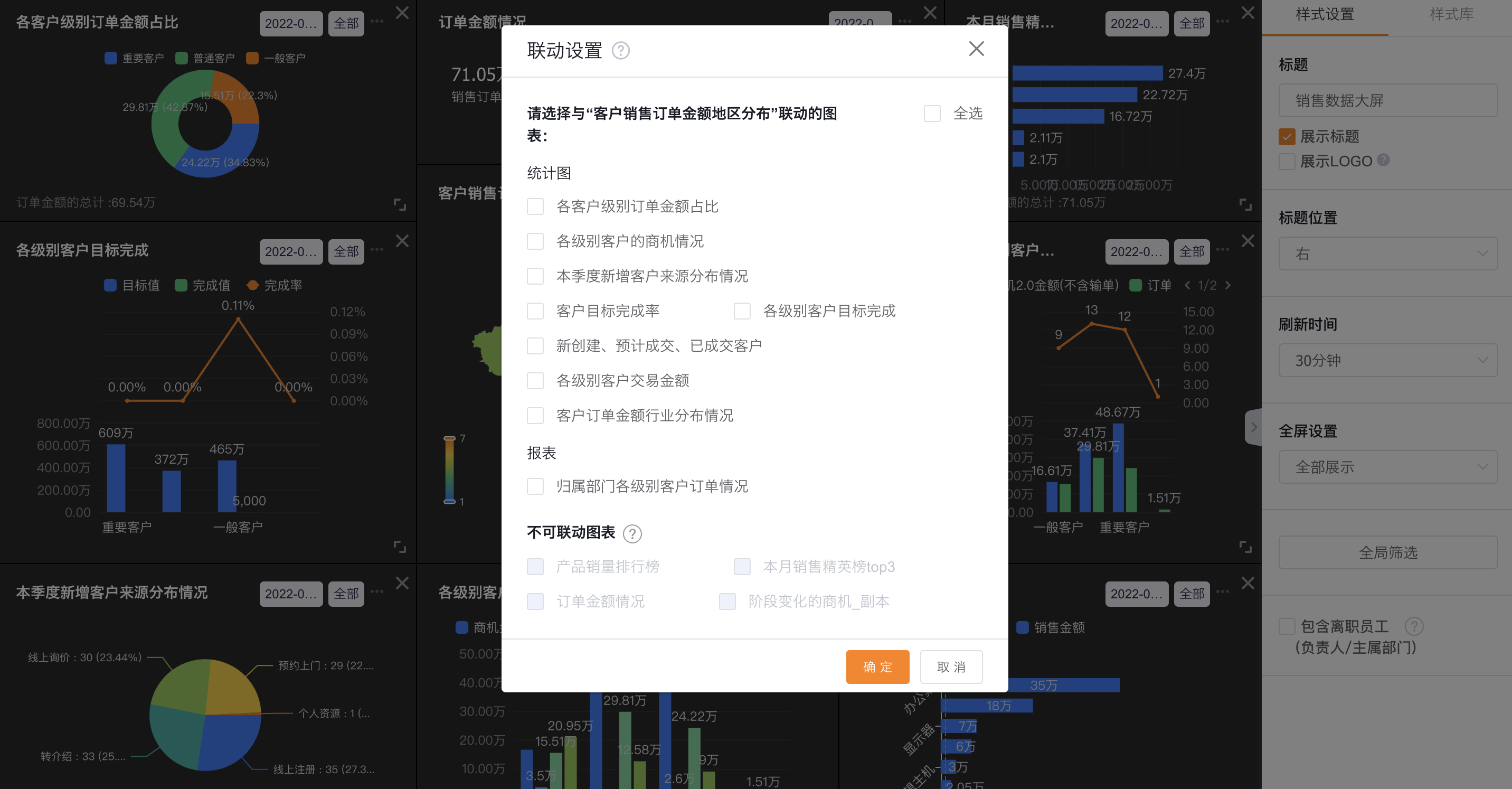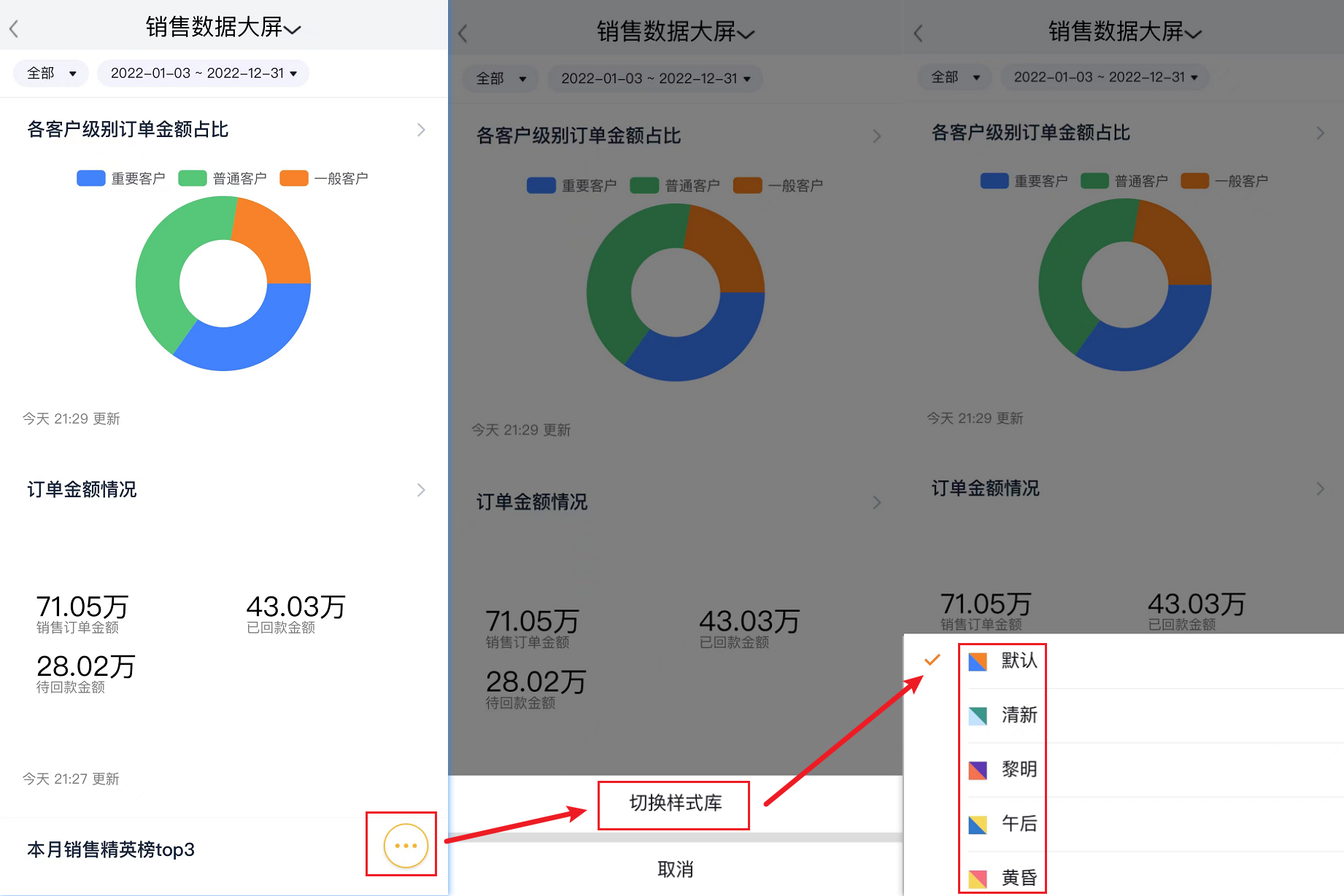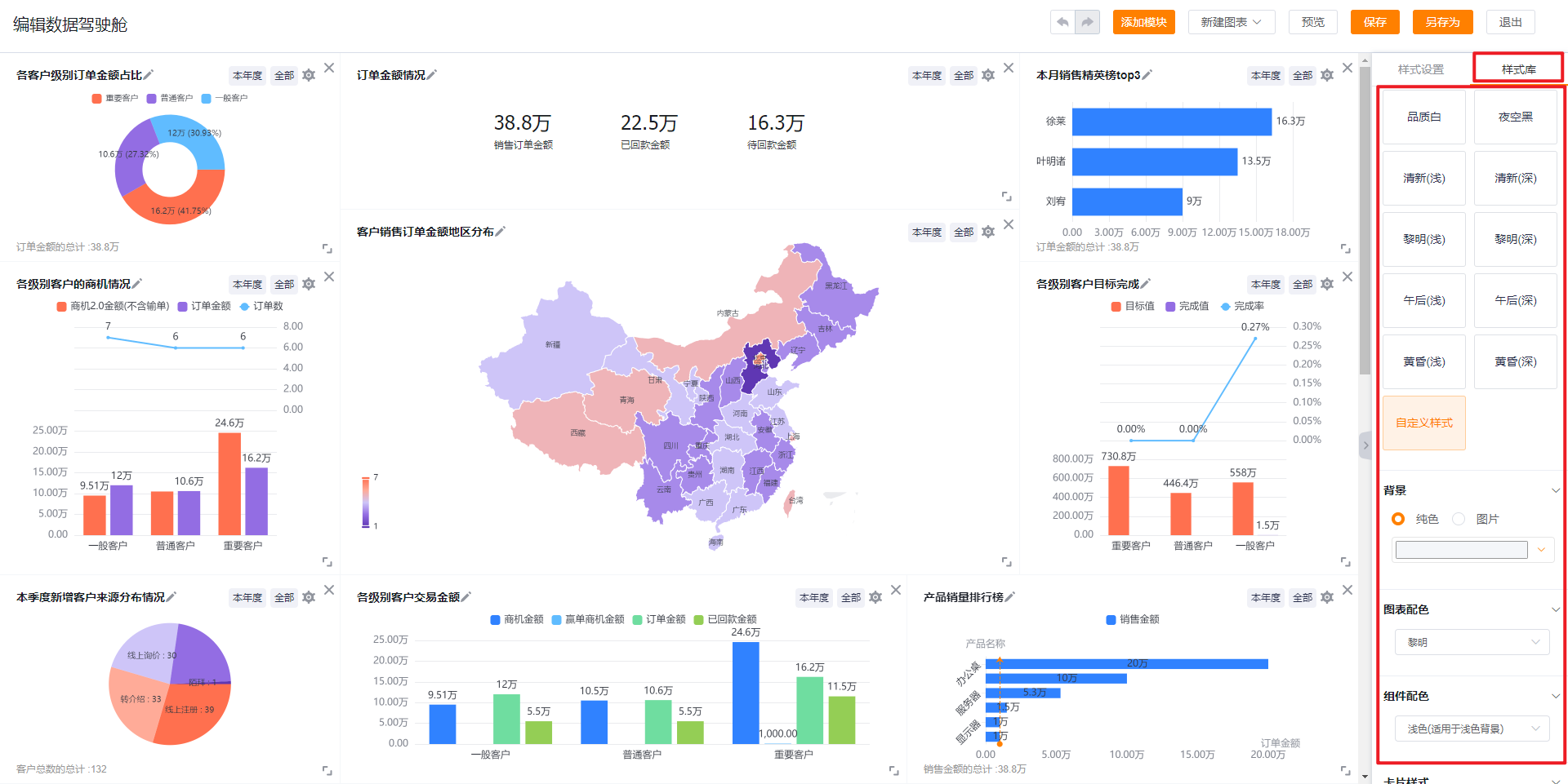 - Style Repository: quality white, night sky black, fresh (light), fresh (deep), dawn (light), dawn (deep), afternoon (light), afternoon (deep), dusk (light), dusk (deep) 10 styles. Users can also customize styles, set custom backgrounds, chart color matching, component color matching, etc.