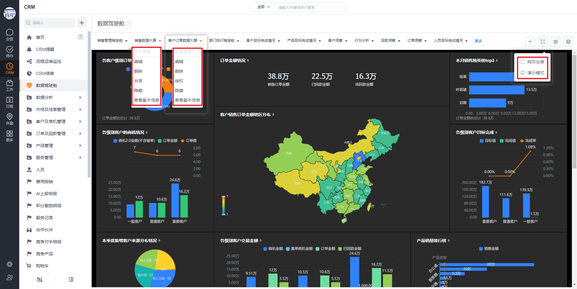 - Authorize: Only CRM administrators and report administrators can authorize the "Enterprise Type" cockpit to be viewed by others. After the authorization is cancelled, others will no longer be able to see it.