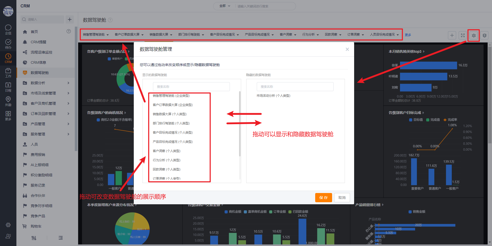 - Save as: copy the current data dashboard, you can re-edit the name of the data dashboard, and the CRM administrator and report administrator can change the type of dashboard.