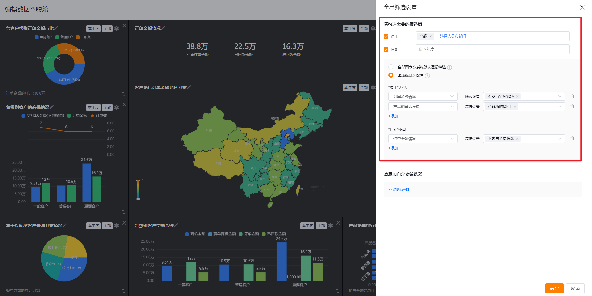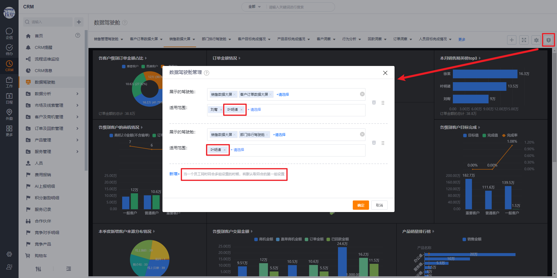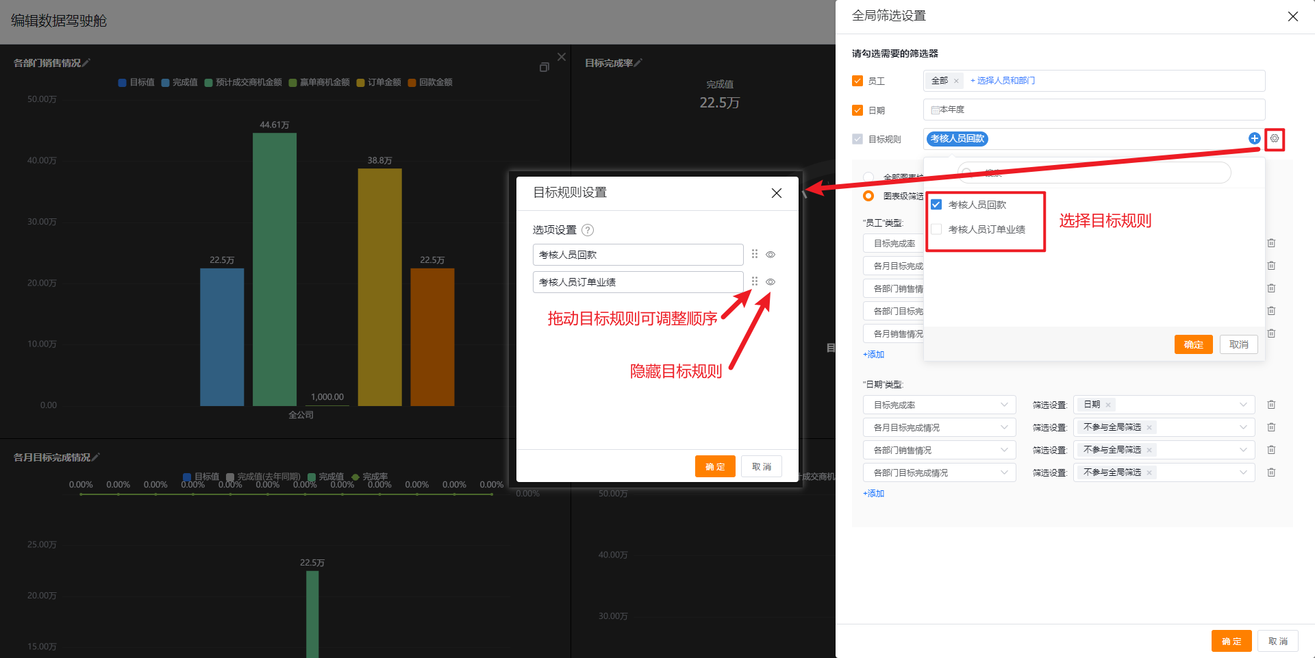 - Goal Settings Custom Filter: Only when the CRM administrator, report administrator, and target rule administrator edit the dashboard, the global filter of the target rule can be configured.