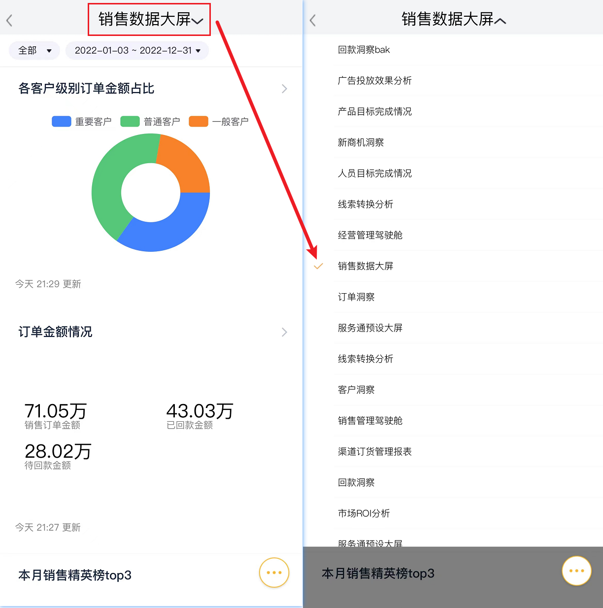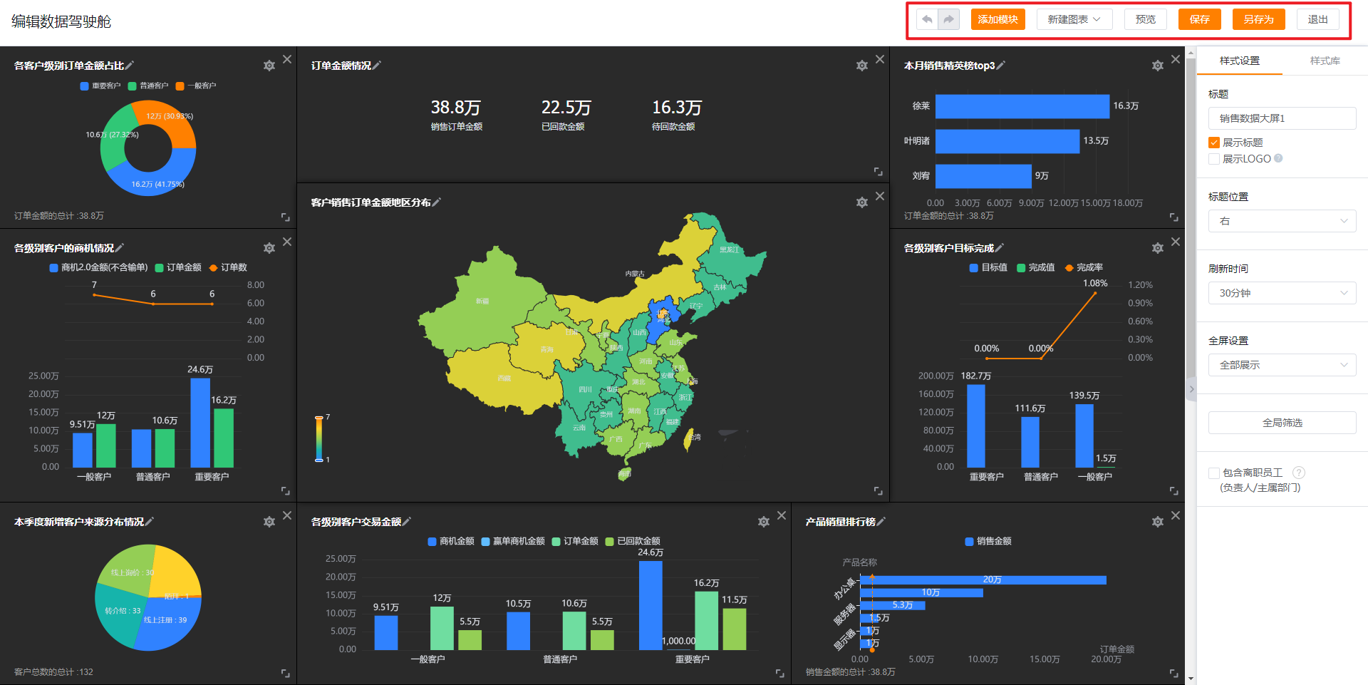 - Edit: Enter the editing interface of the data dashboard. Individuals can only edit the cockpit created by themselves, not the cockpit shared/authorized to me by others, and can "save as" their own dashboard. CRM administrators and reporting administrators can edit all dashboards.