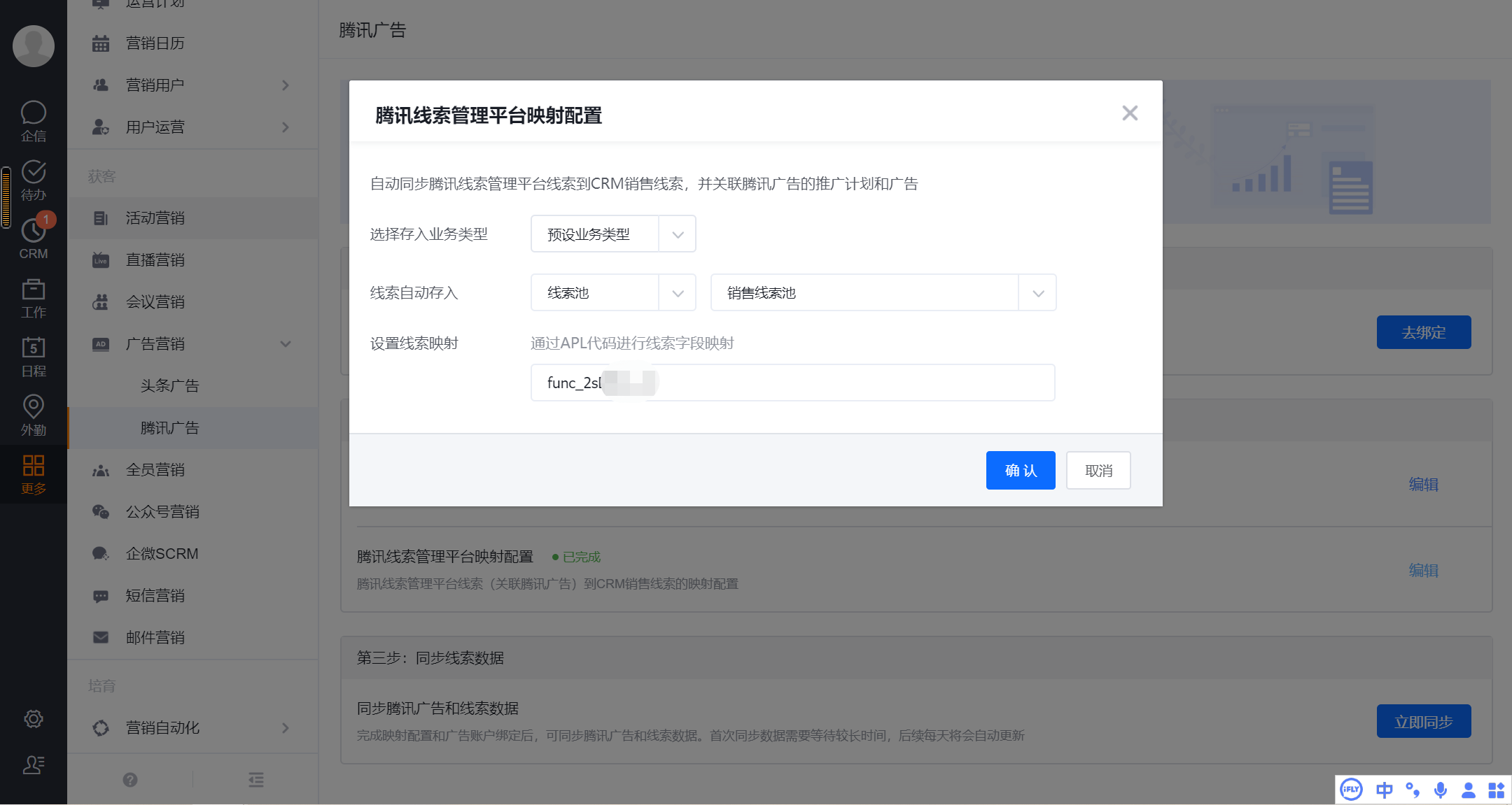 (2) After the mapping configuration is set, it will automatically synchronize the leads of Tencent leads management platform and store them in CRM. The stored leads pool can be configured, and field mapping can be configured through functions. This item is an advanced configuration item, which involves function settings. You can contact ShareCRM CSM for advice on how to set it.