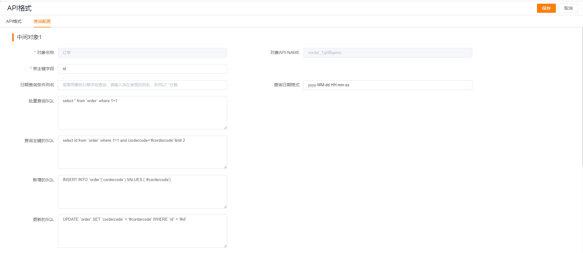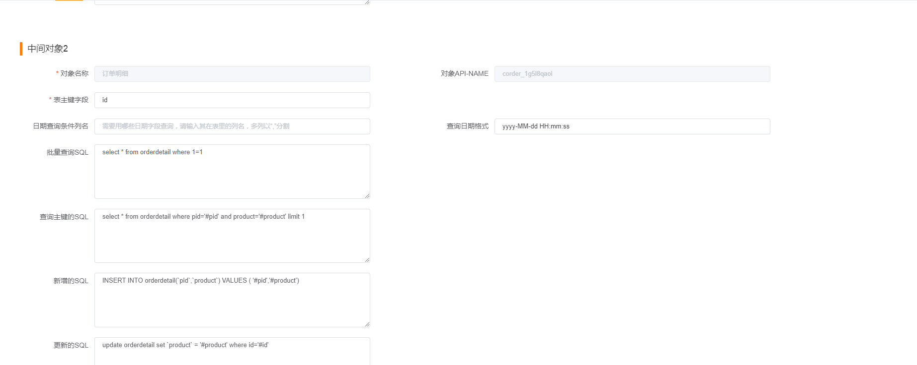 7. Updated sql: the sql template used to update the table from CRM to the intermediate library: all values that need to be replaced in the template. All are written in the format of '#field name in the field list', if the primary key of the main table needs to be referenced in the details: replace it with '#pid'