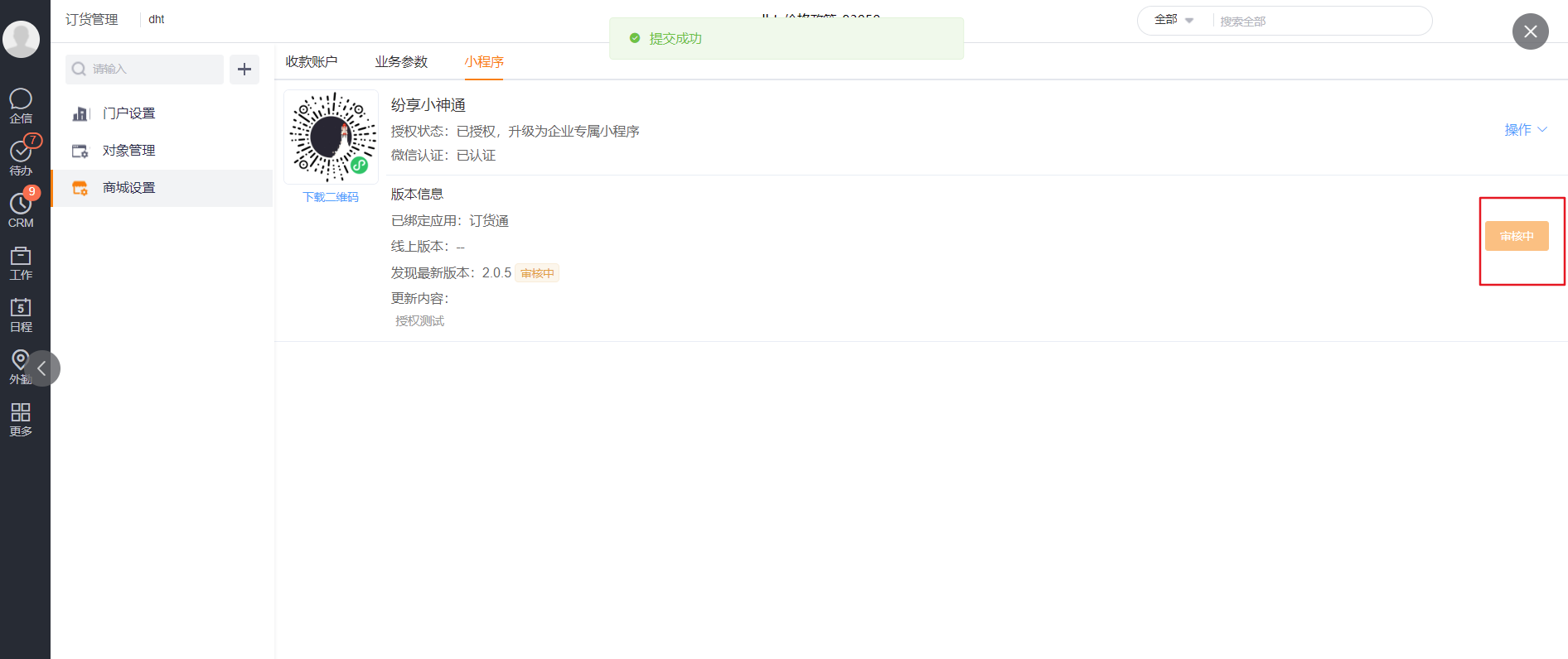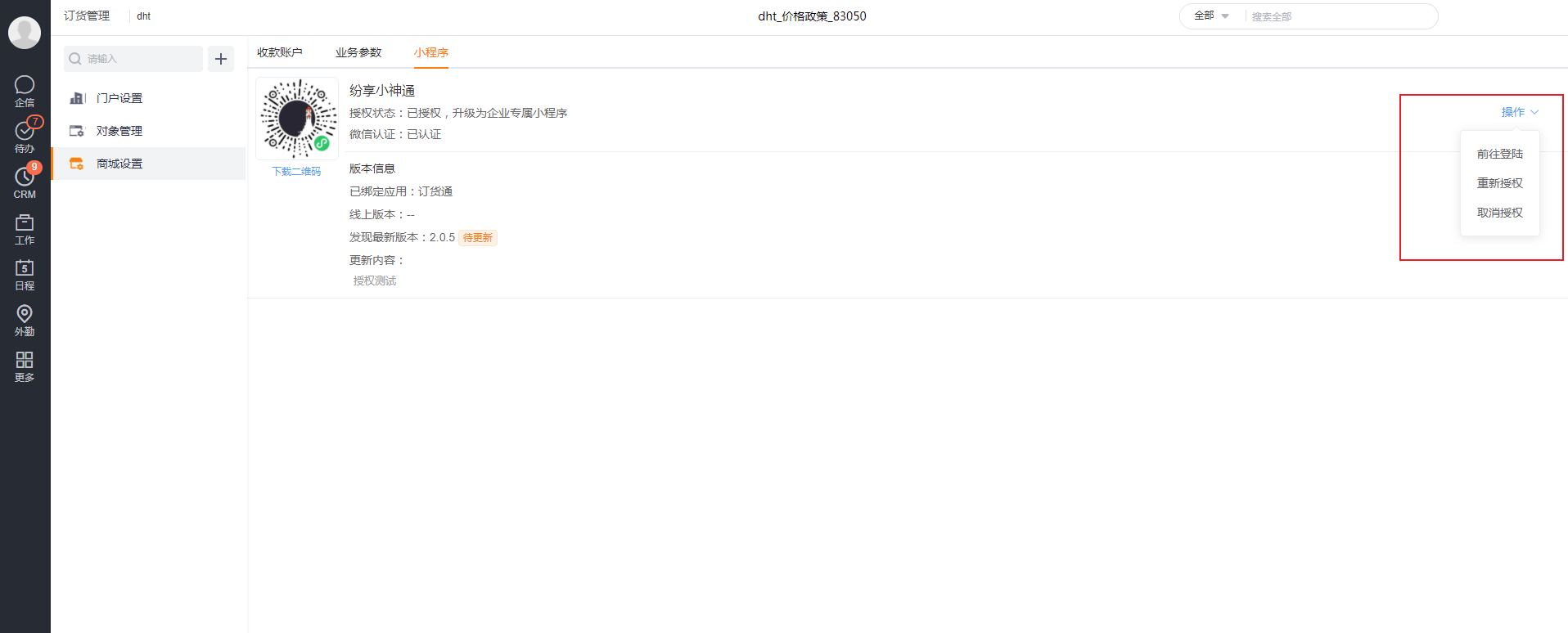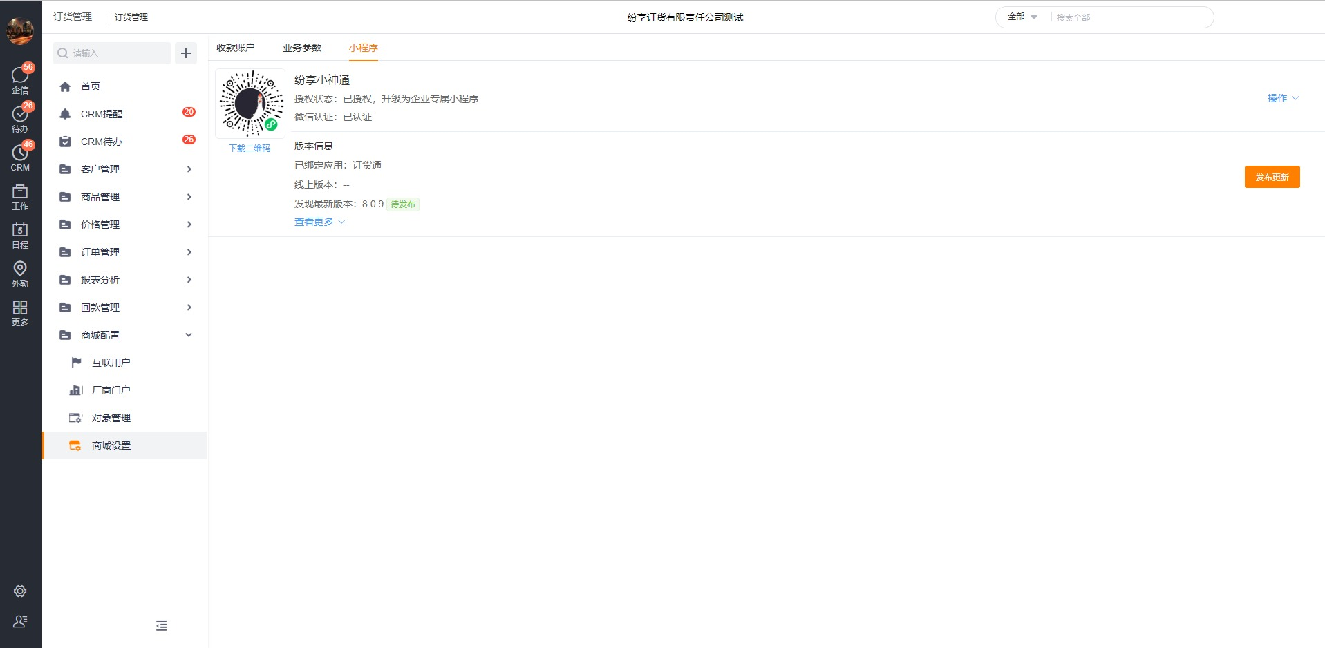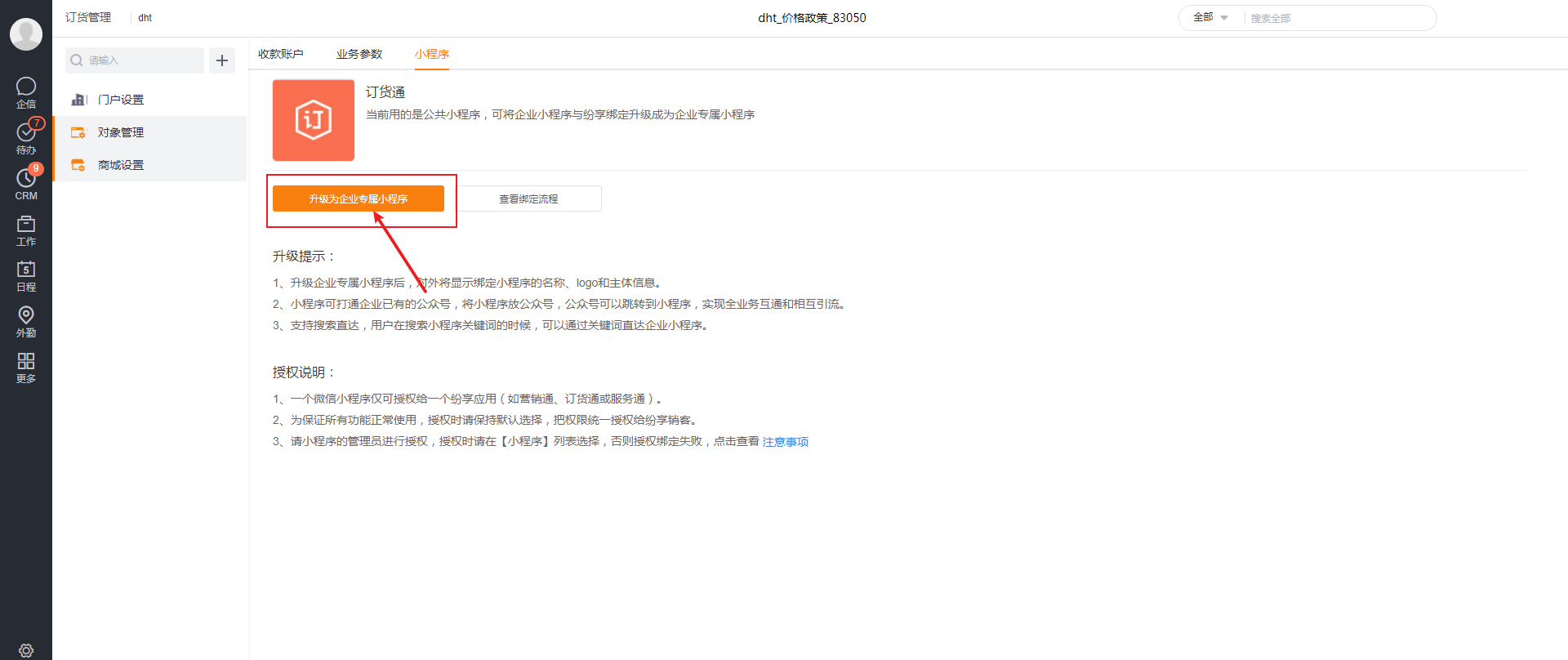 Accounts can upgrade the platform mini program (ShareCRM E-Order) to an exclusive mini program in [Order Management] > [Mall Settings] > Mini Programs tab page. Before upgrading the exclusive mini program, the account needs to apply for an empty shell mini program and complete the certification (For uncertified applets, please complete the certification first before authorizing them to ShareCRM), and then authorize them to ShareCRM and complete the packaging of functions. After completion, accounts can use their own mini program to display their company name, logo and subject information to the outside world. The mini program can also be associated with the company's existing official account to achieve full business interoperability and mutual drainage (Note: if If there is a binding official account on the ShareCRM platform, the bound mini program should be the same subject as the official account, otherwise the mini program and the official account cannot jump and share data).
