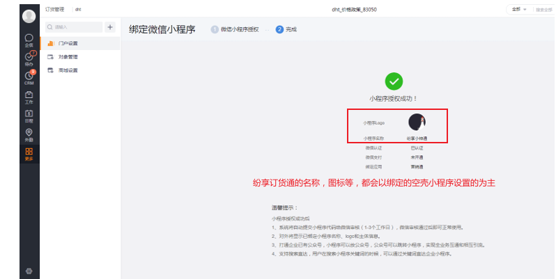 1. One WeChat mini program can only be authorized to one ShareCRM app (such as E-Marketing, E-Order or E-Service).