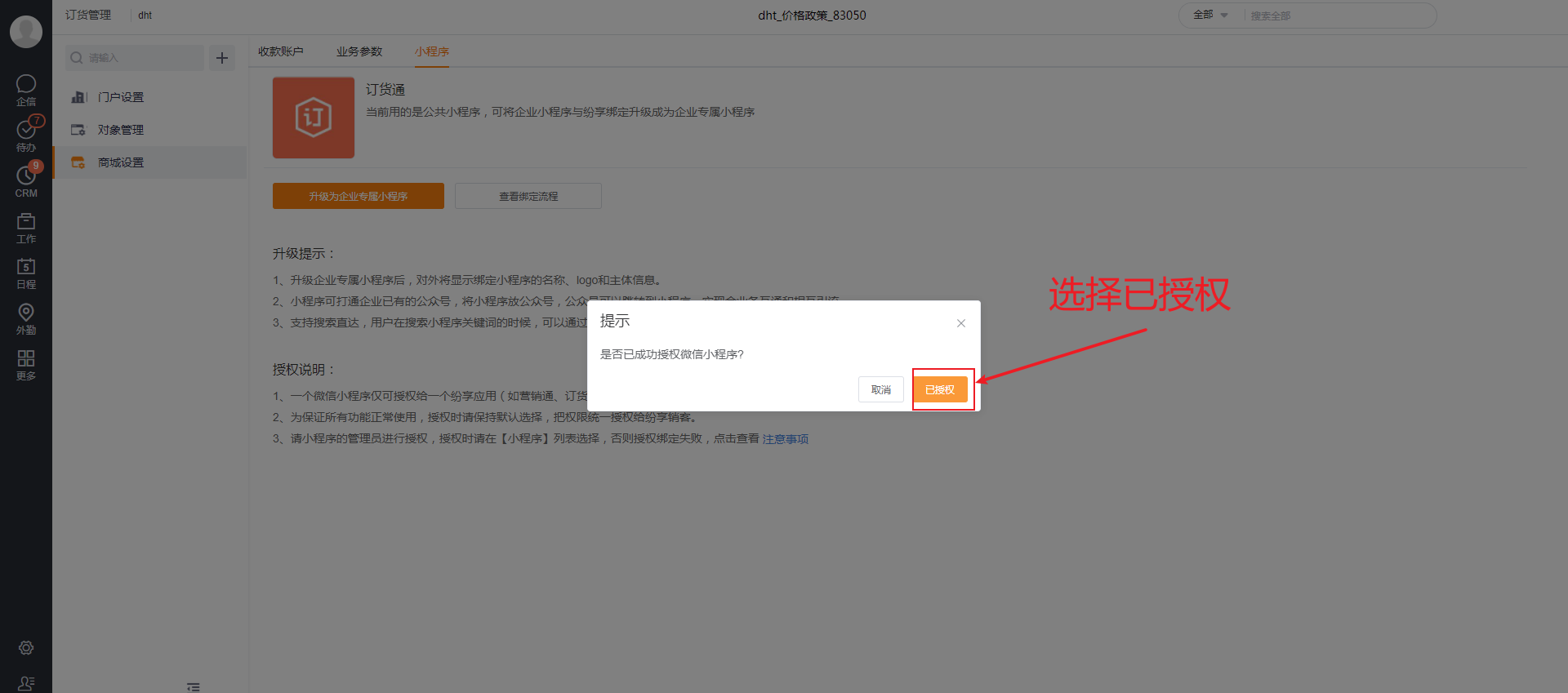 At this time, the system prompts, "Have you successfully authorized the WeChat Mini Program?" Click [Authorized].