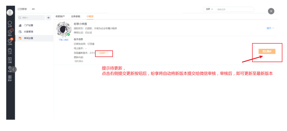 If there is a new version of OrderPass released, it will prompt [to be updated] on the interface of the applet. At this time, click [Submit Update], and Funshare will automatically submit the latest version of OrderPass to WeChat for review. At this time, the interface will prompt [Under review] , you can update to the latest version after review;