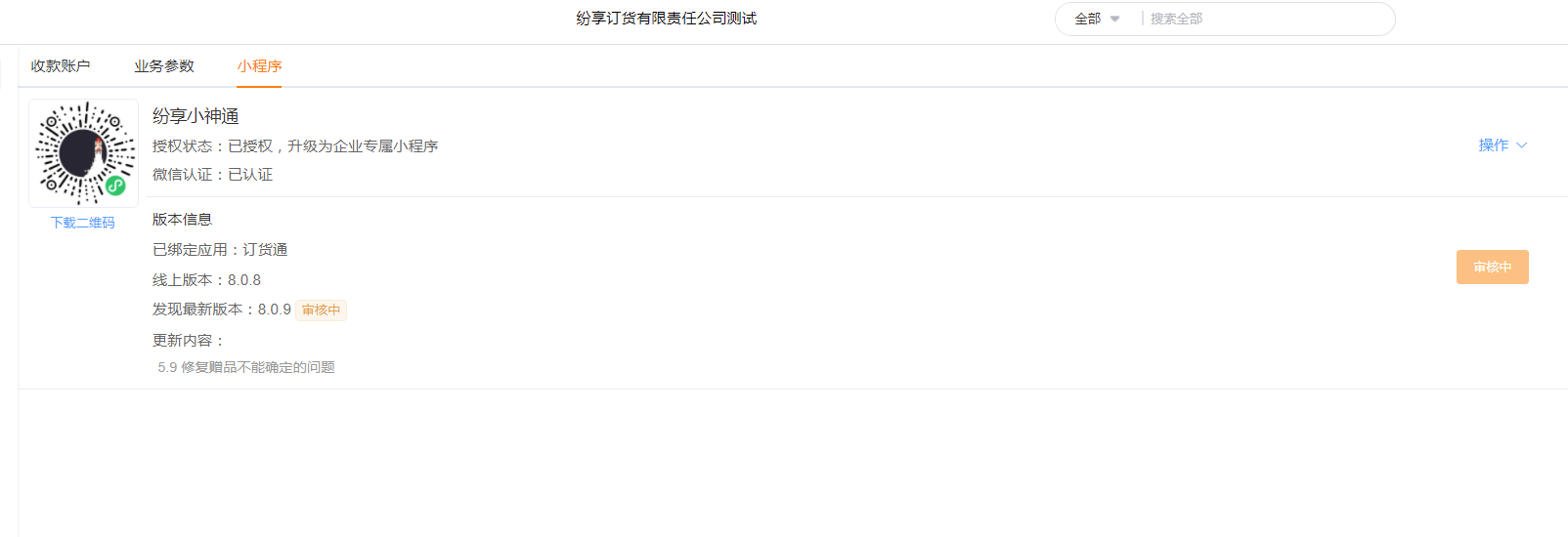After the authorization is successful, you can see the basic information of the bound applet on the applet tab page, including authorization status, authentication status, version information, logo, name, etc.: