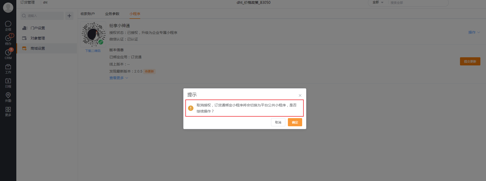 Note: Canceling the authorization on the current interface will only cancel the relationship with the Fanxiang CRM tenant, and the WeChat server will still think that the Mini Program is authorized to our platform (that is to say, it can still be viewed in the background of the Mini Program if it has not been unbound) Order pass third-party platform),