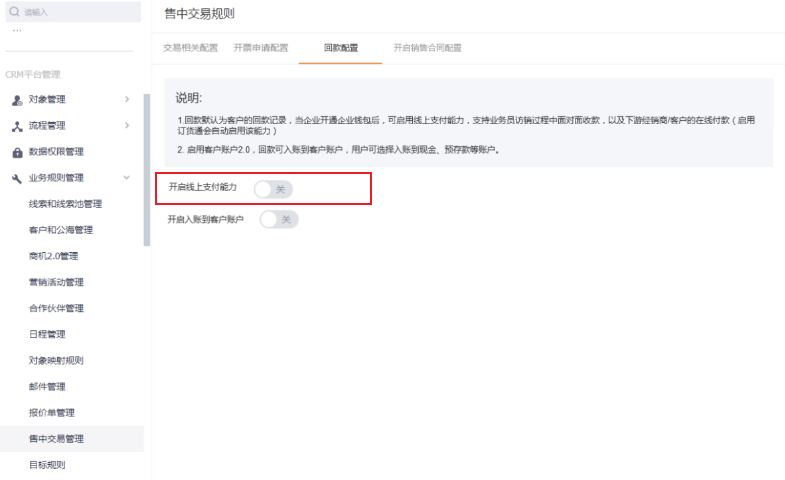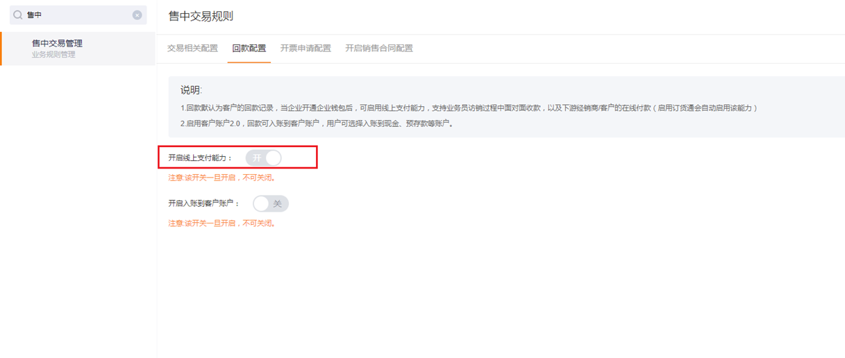 After configurations 1 and 2 are completed, you need to turn on the switch of online payment (path: management background > in-sale transaction rules > payment return configuration > enable online payment capability)